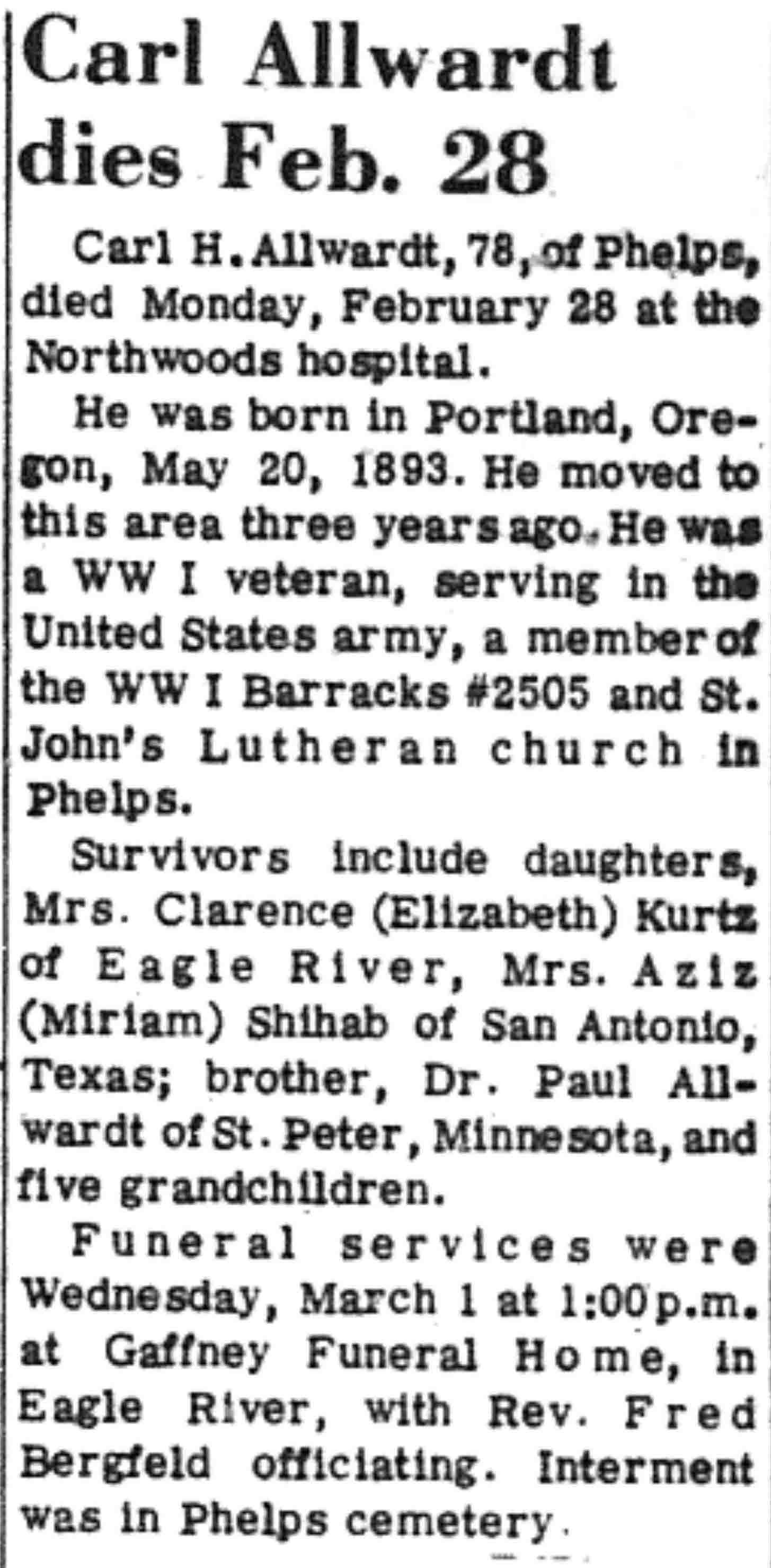 | Allwardt | Carl H | 20 May 1893 | 28 Feb 1972 | VCN | 02 Mar 1972 | 3 |