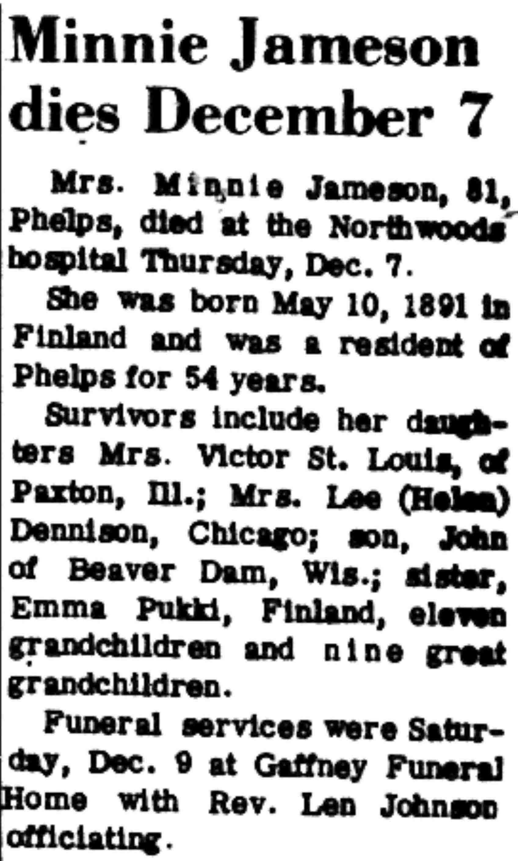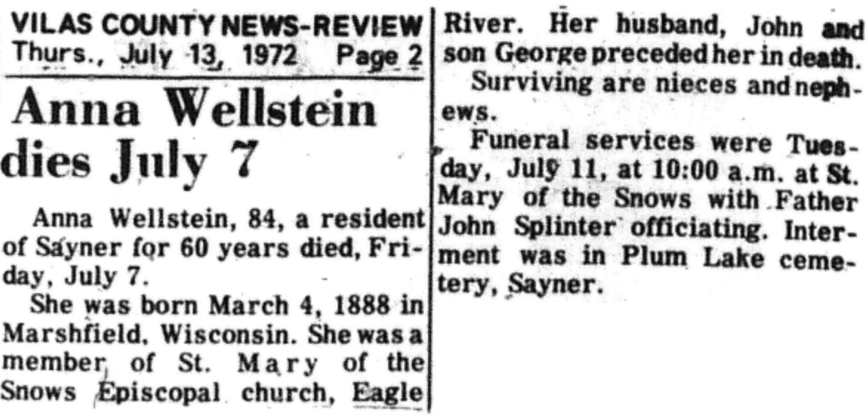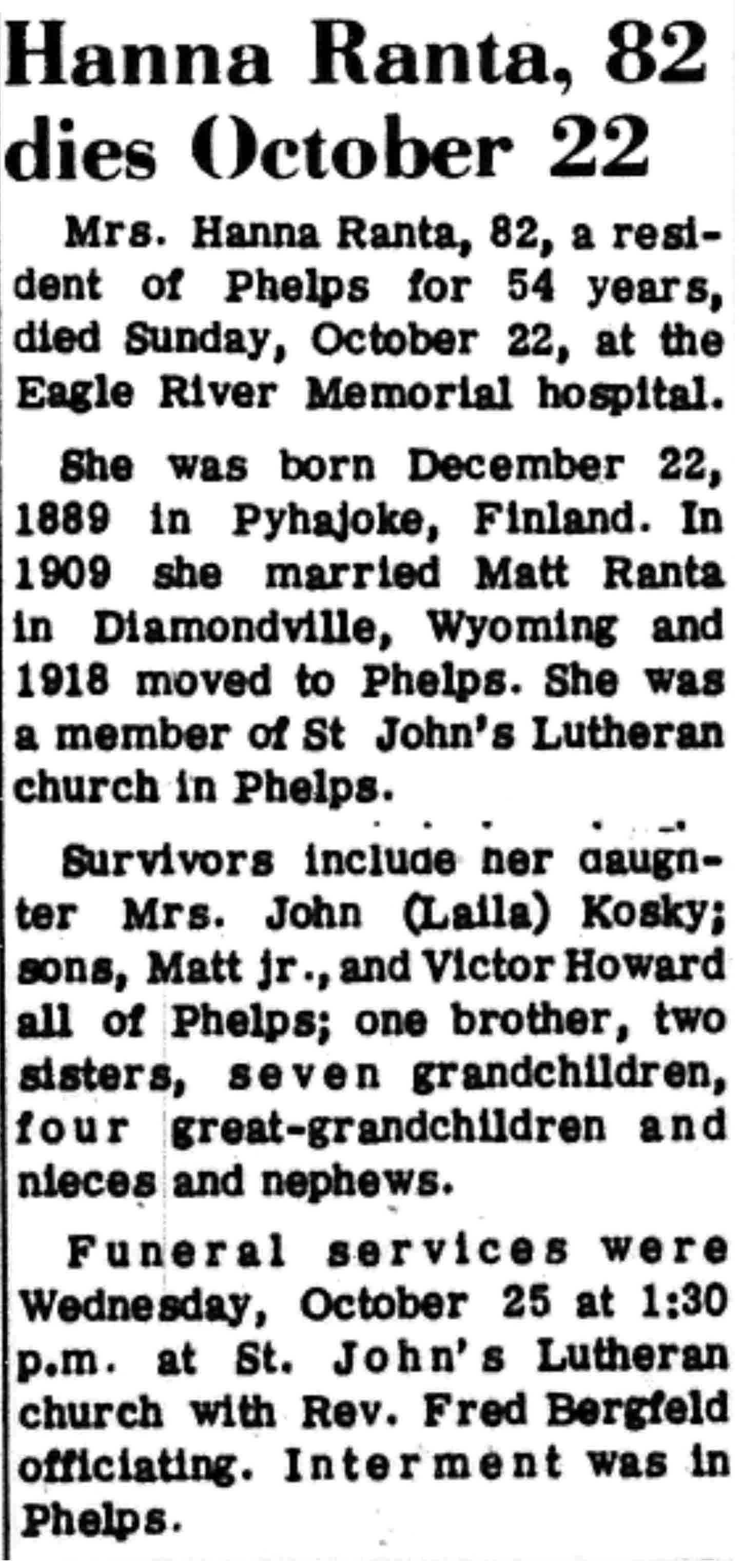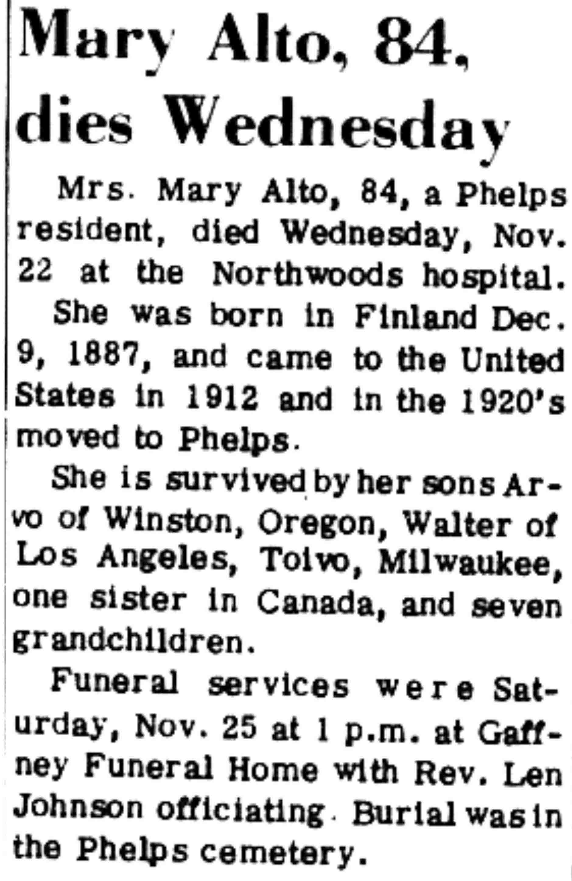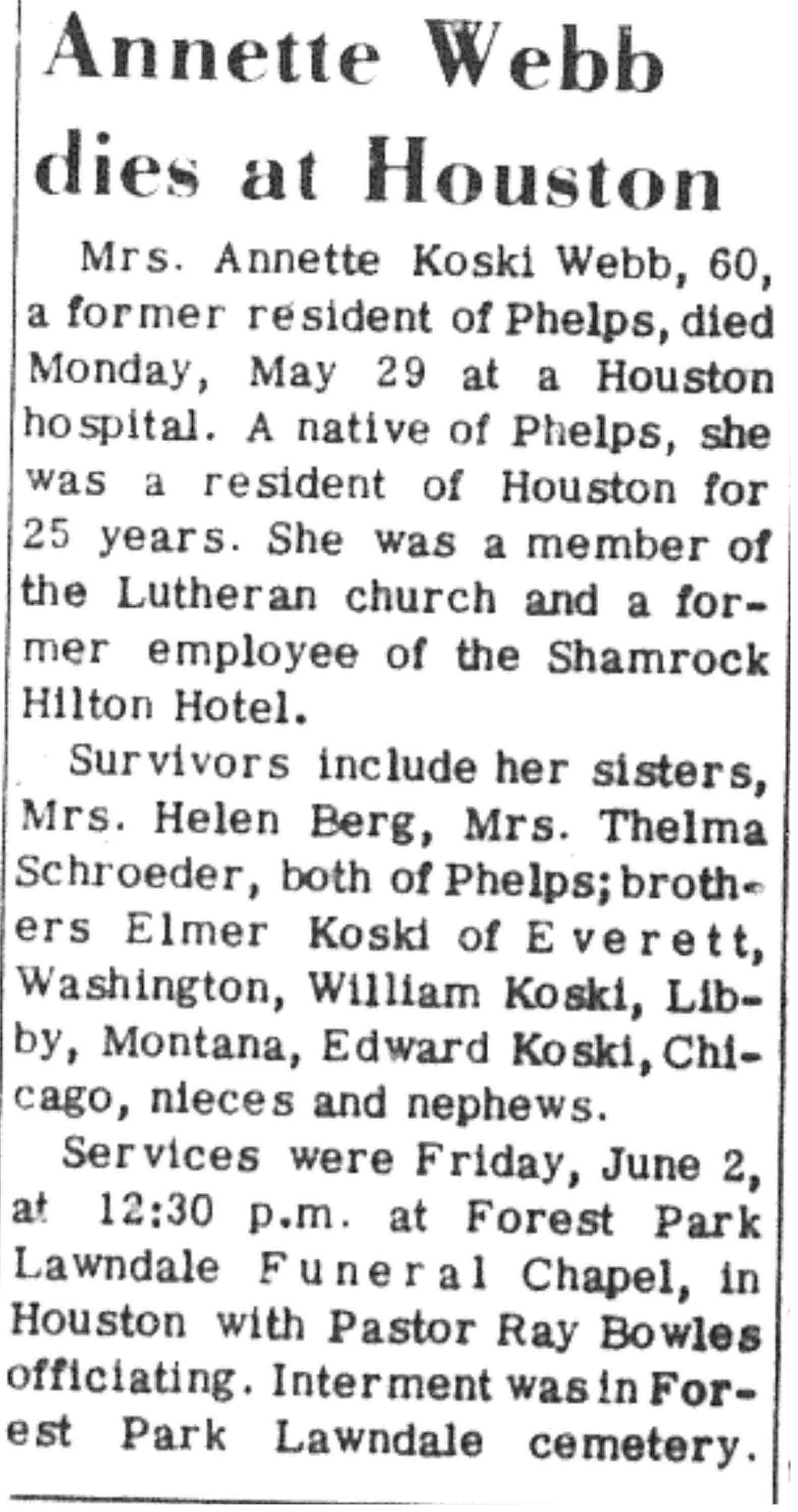 | Webb | Annette (Koski) | c 1912 | 29 May 1972 | VCN | 08 Jun 1972 | 3 |
