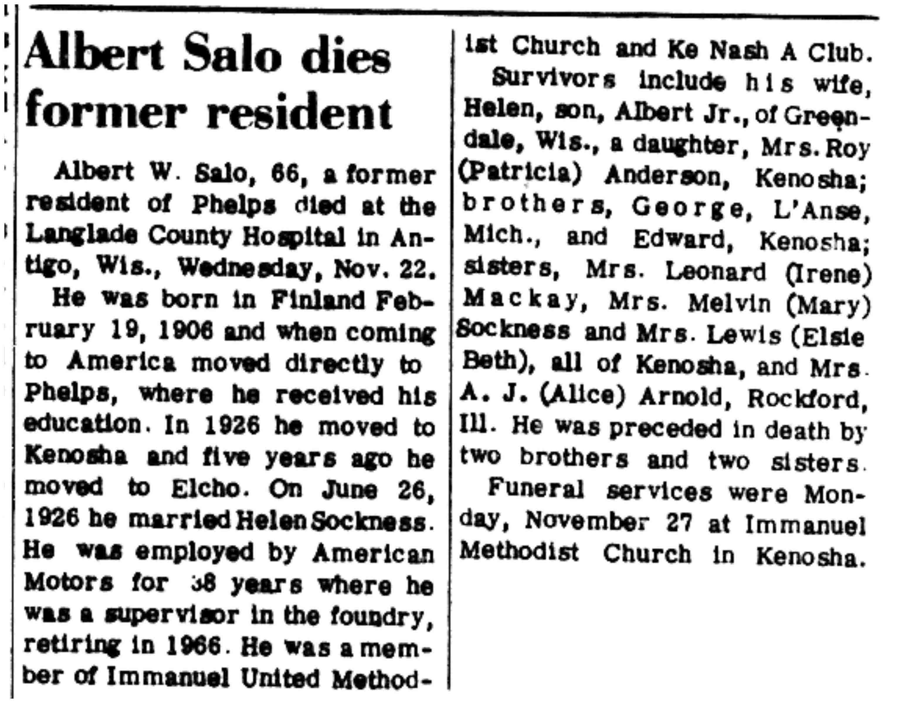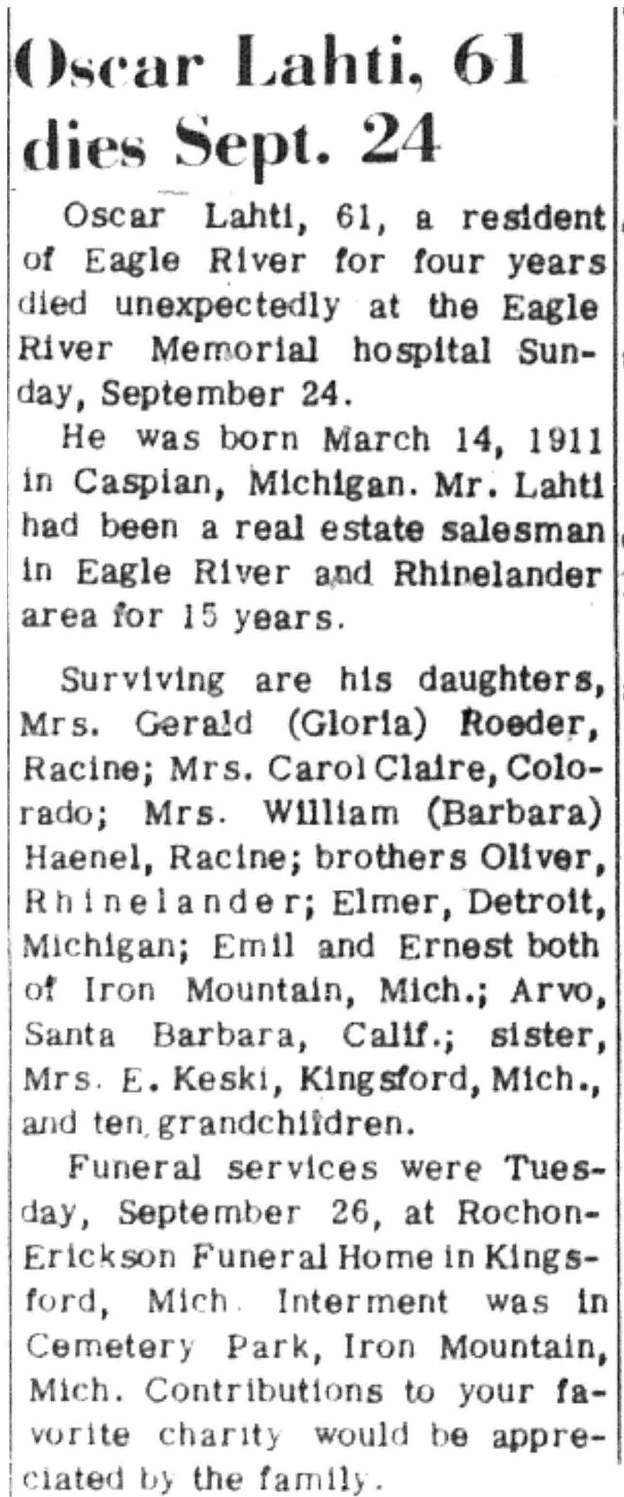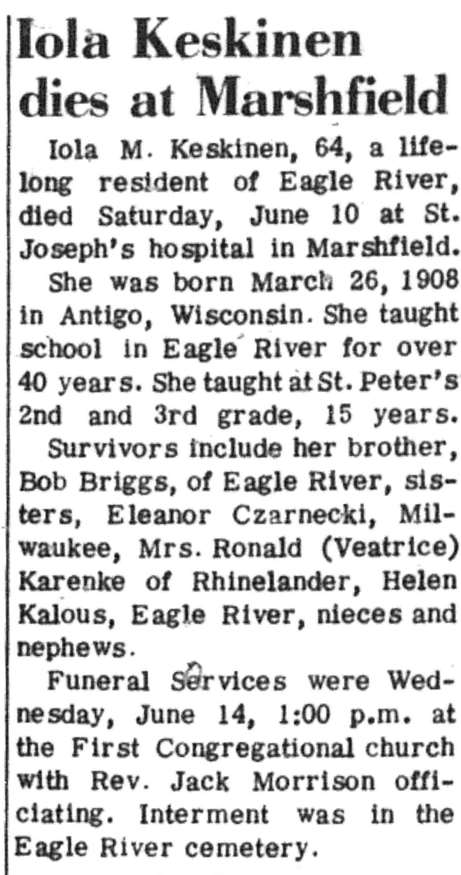 | Keskinen | Iola M (Briggs) | 26 Mar 1908 | 10 Jun 1972 | VCN | 15 Jun 1972 | 2 |