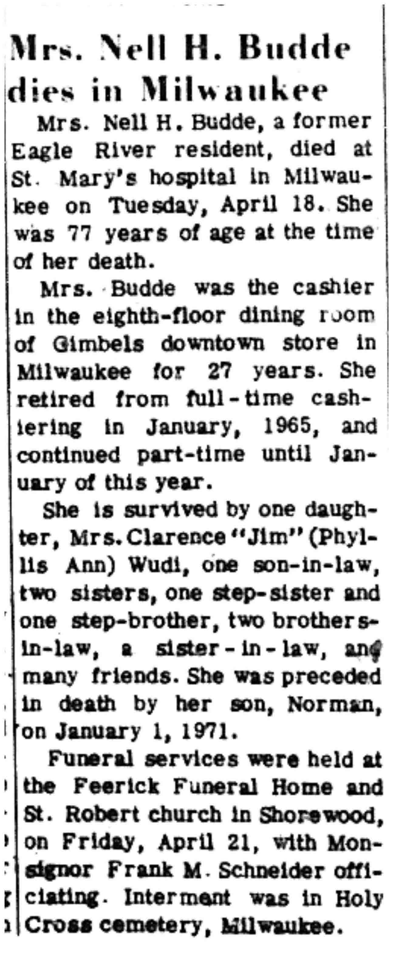 | Budde | Nell H | c 1895 | 18 Apr 1972 | VCN | 11 May 1972 | 17 |