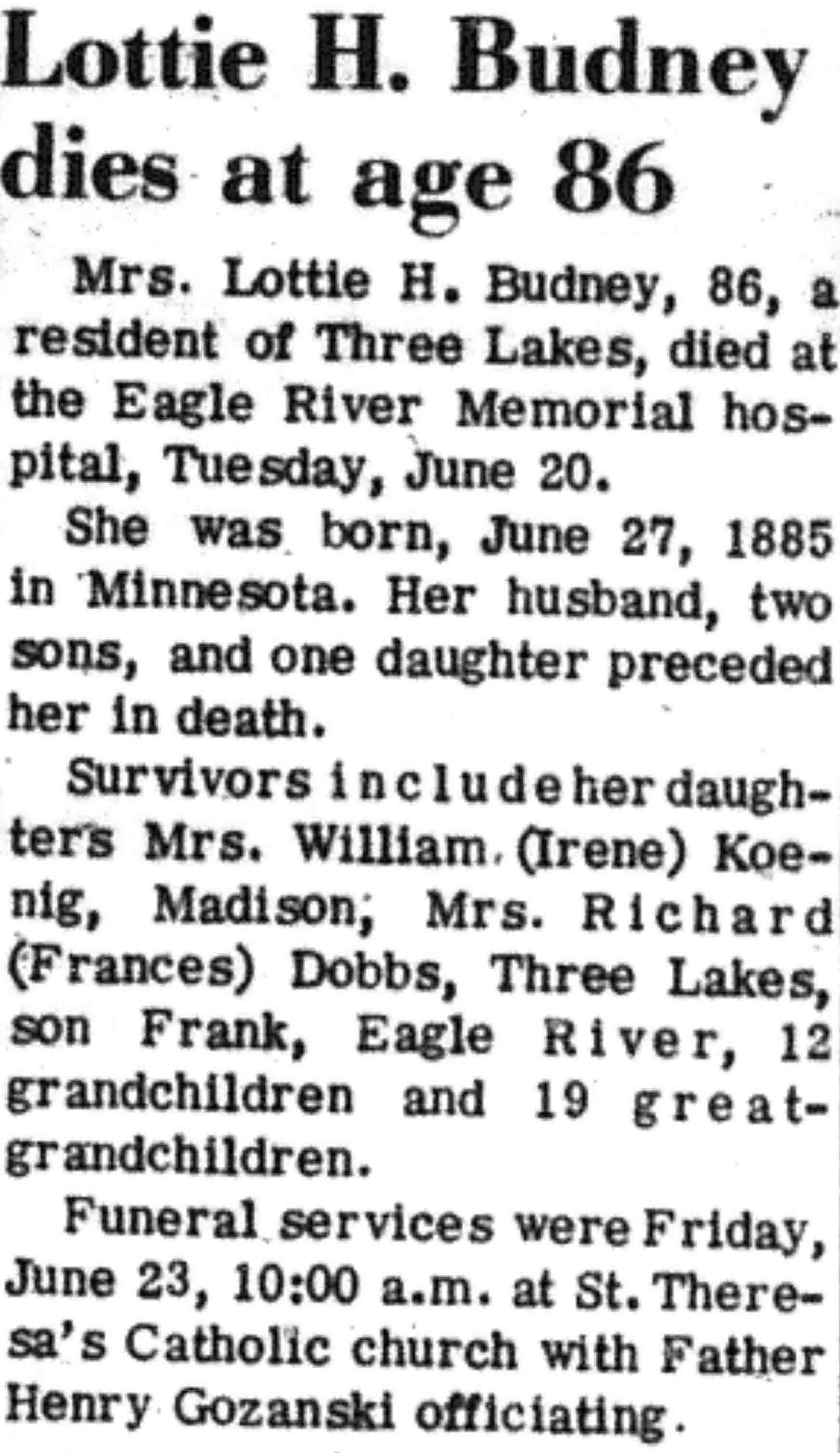 | Budney | Lottie H | 27 Jun 1885 | 20 Jun 1972 | VCN | 29 Jun 1972 | 9 |