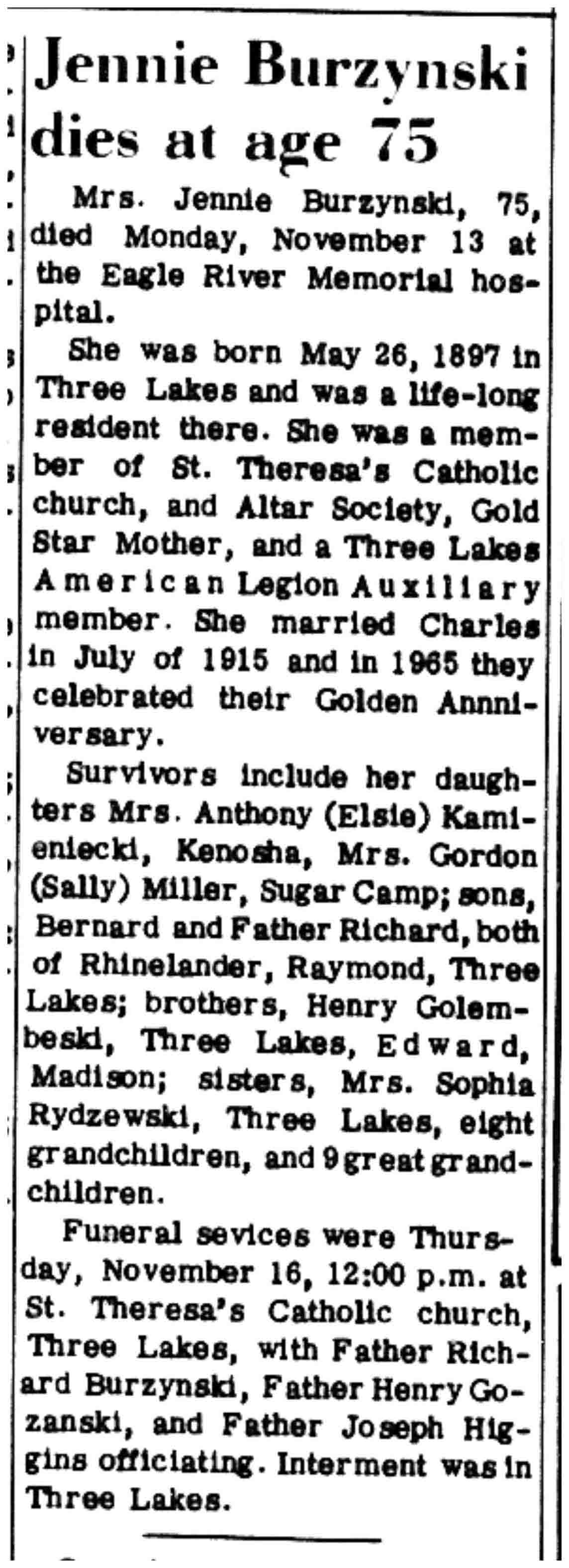 | Burzynski | Jennie (Golembeski) | 26 May 1897 | 13 Nov 1972 | VCN | 16 Nov 1972 | 3 |