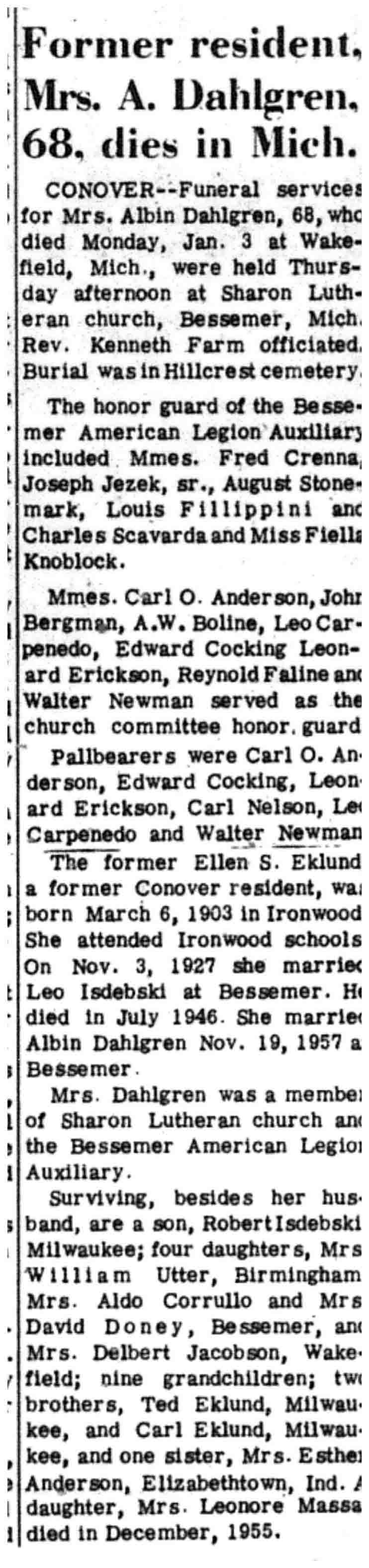 | Dahlgren | Ellen S (Eklund) | 06 Mar 1903 | 03 Jan 1972 | VCN | 13 Jan 1972 | 11 |