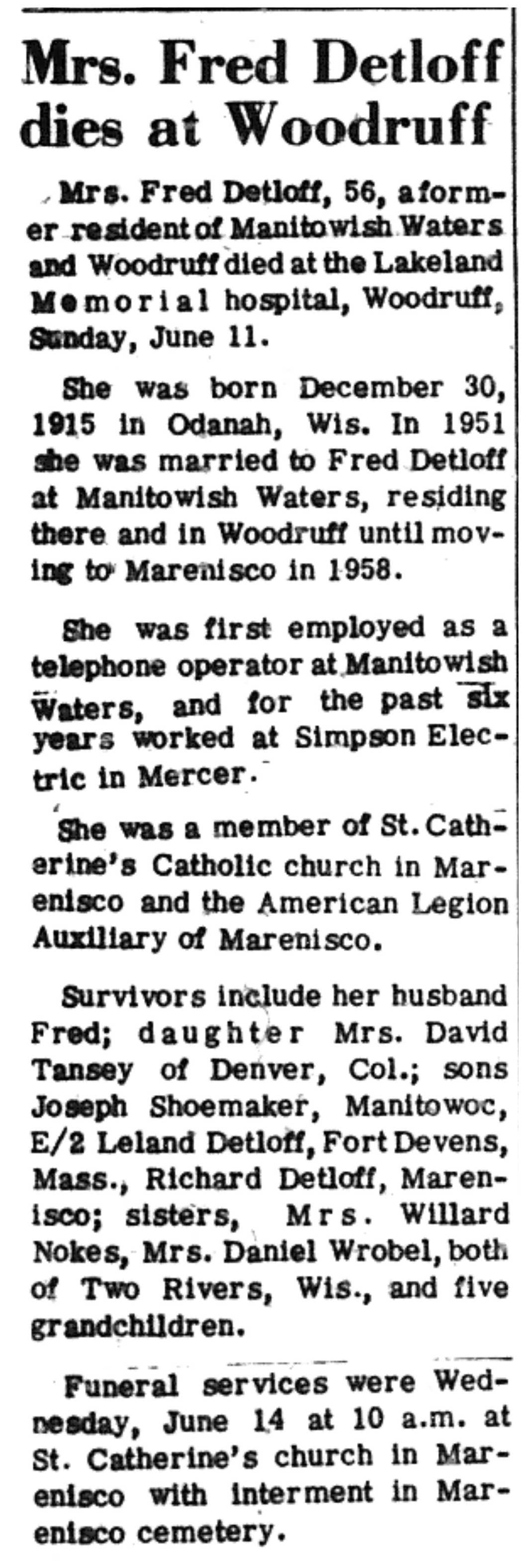 | Detloff | Fred, Mrs | 30 Dec 1915 | 11 Jun 1972 | VCN | 15 Jun 1972 | 7 |