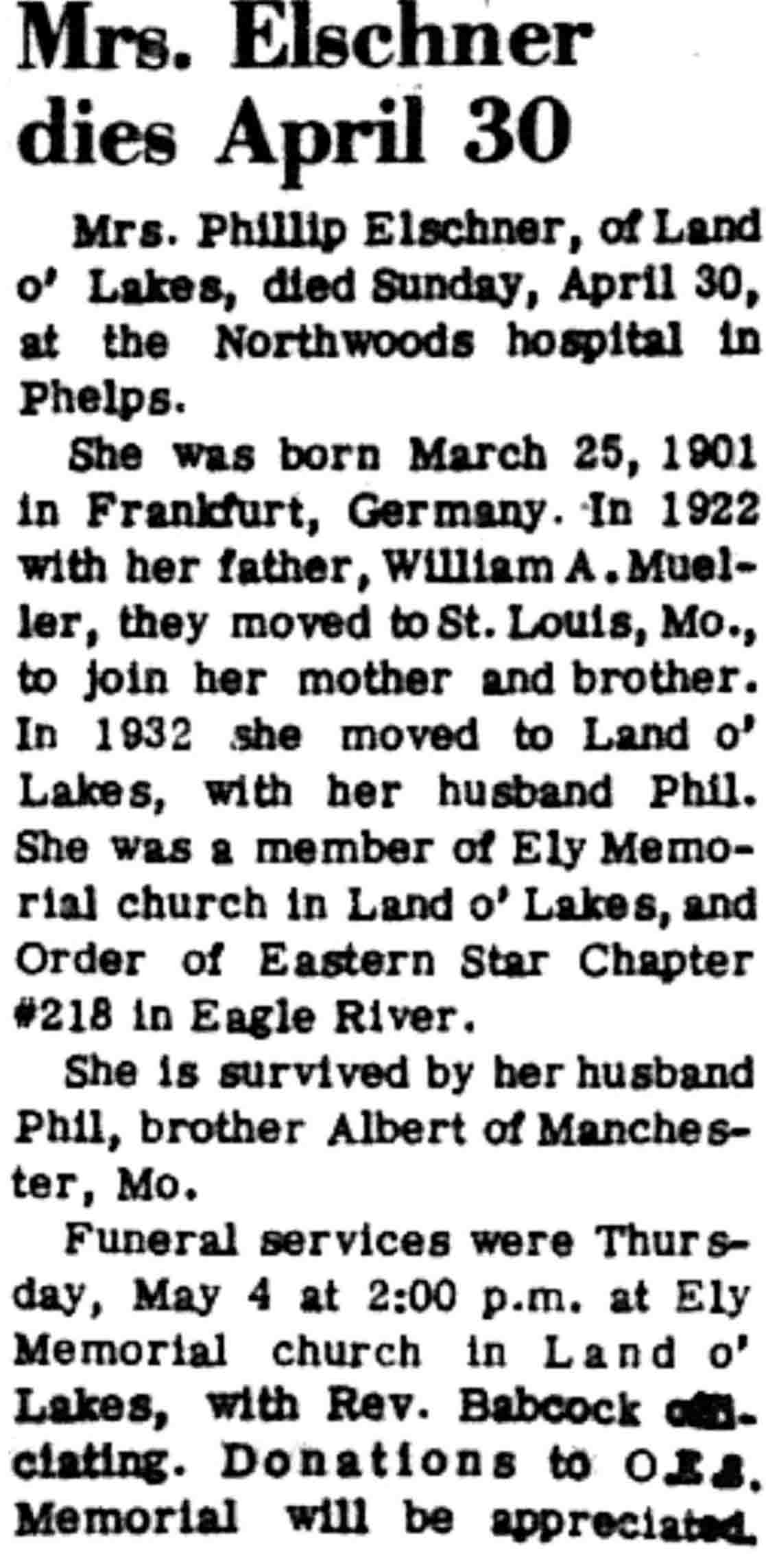 | Elschner | Phillip, Mrs (Mueller) | 25 Mar 1901 | 30 Apr 1972 | VCN | 04 May 1972 | 6 |