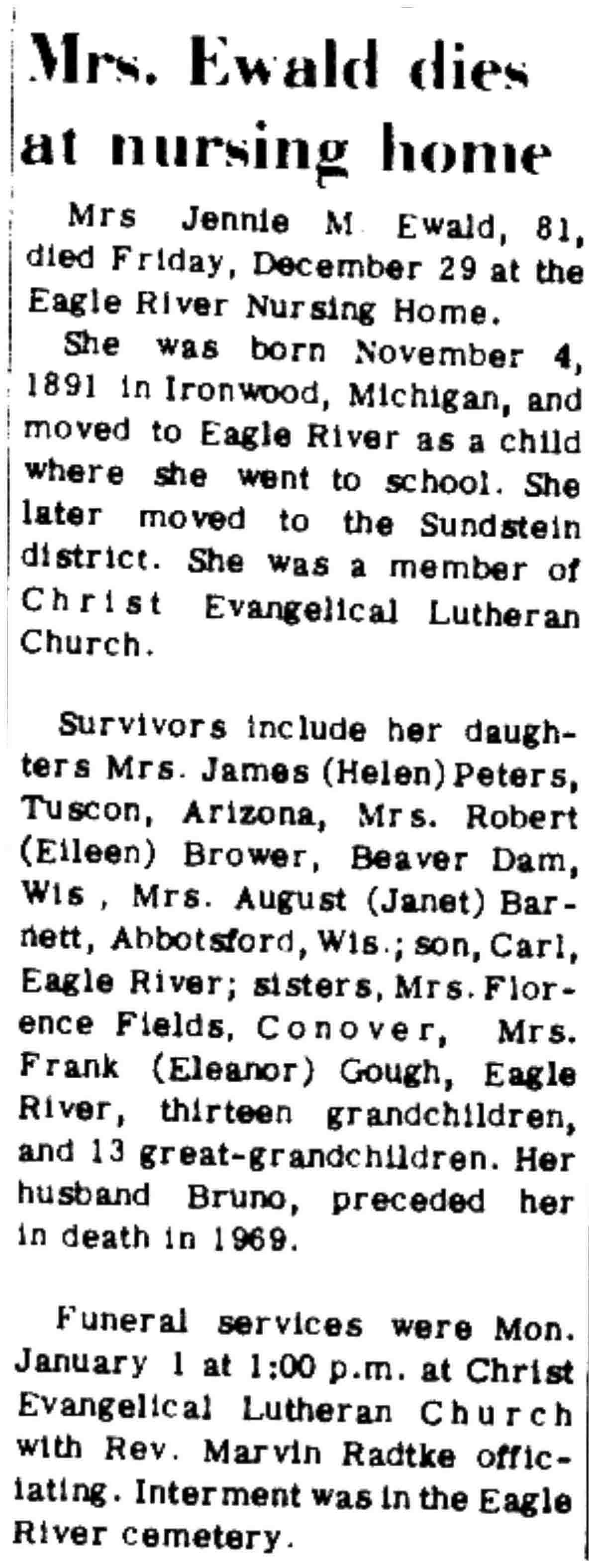 | Ewald | Jennie M | 14 Nov 1891 | 29 Dec 1972 | VCN | 04 Jan 1973 | 3 |