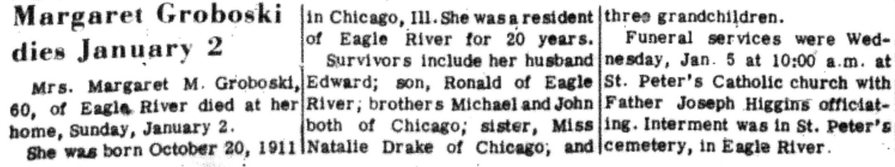 | Groboski | Margaret M | 20 Oct 1911 | 02 Jan 1972 | VCN | 06 Jan 1972 | 3 |
