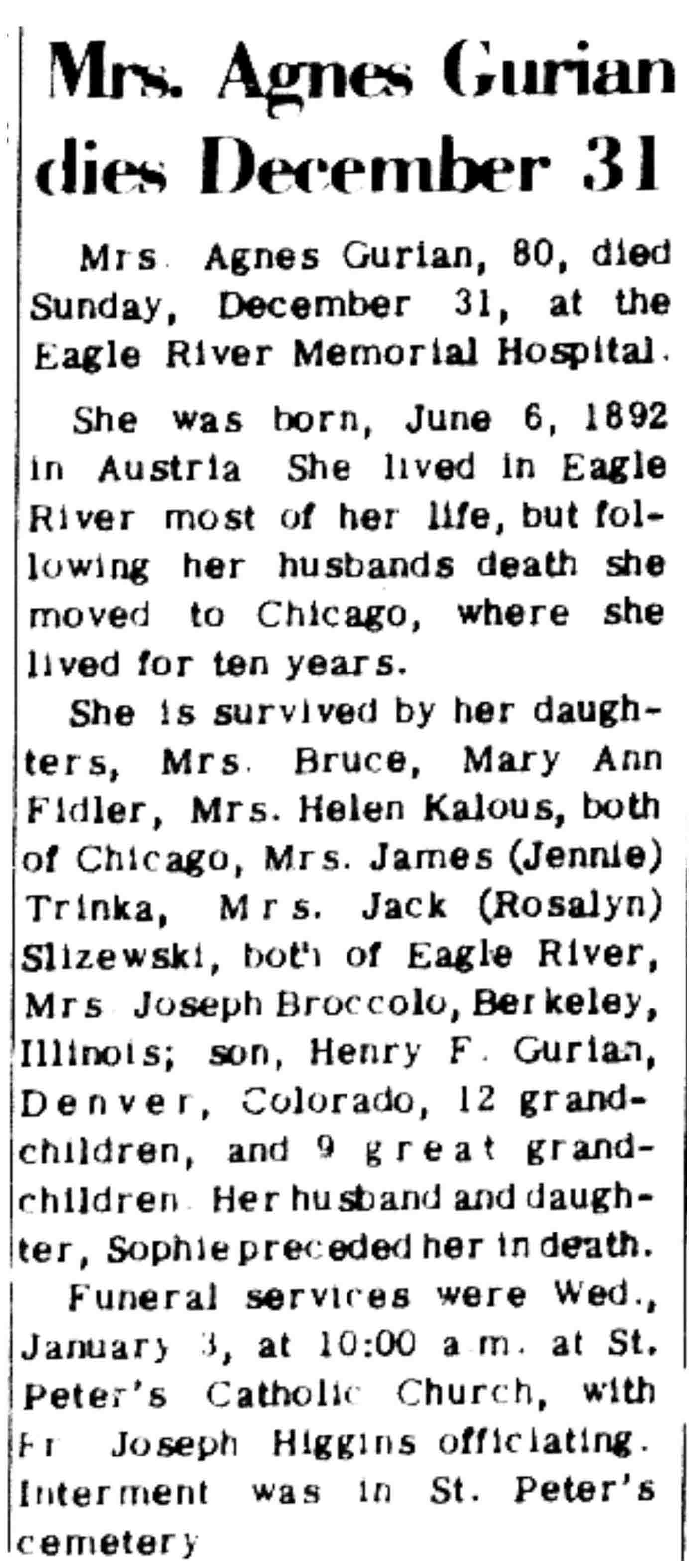 | Gurina | Agnes | 06 Jun 1892 | 31 Dec 1972 | VCN | 04 Jan 1973 | 7 |