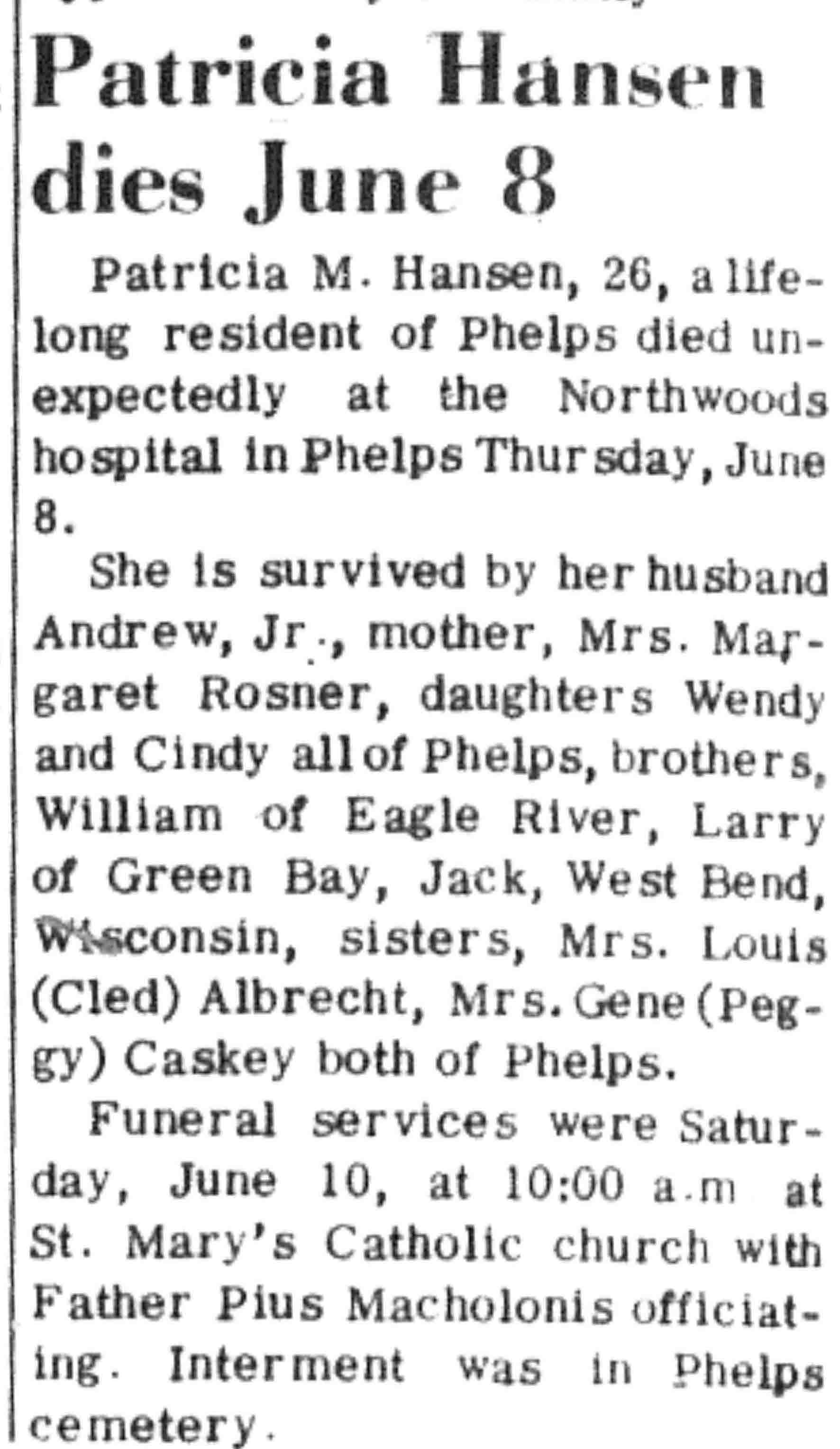| Hansen | Patricia M (Rosner) | c 1946 | 08 Jun 1972 | VCN | 15 Jun 1972 | 2 |