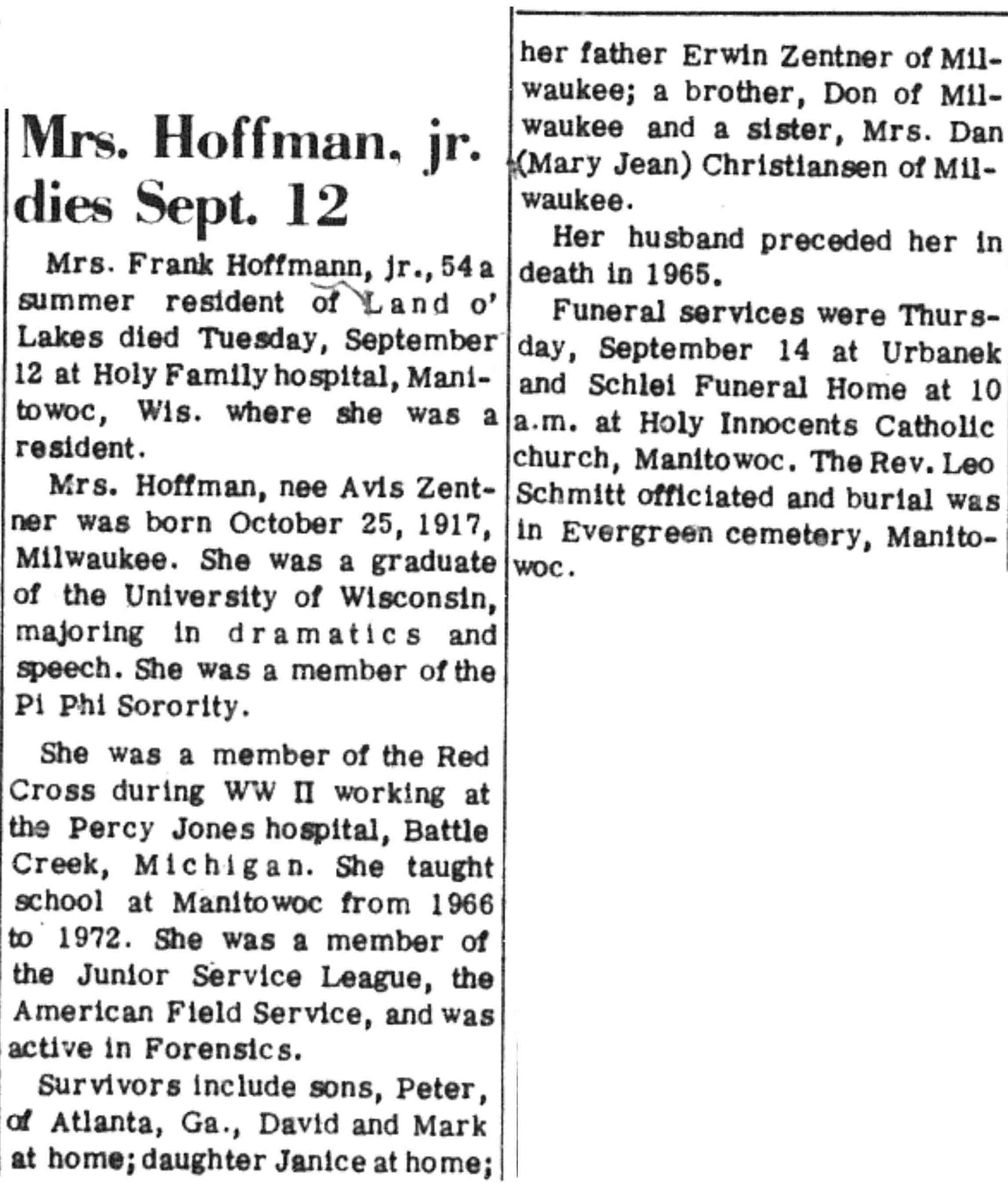 | Hoffman | Avis (Zentner) | 25 Oct 1917 | 12 Sep 1972 | VCN | 28 Sep 1972 | 12 |