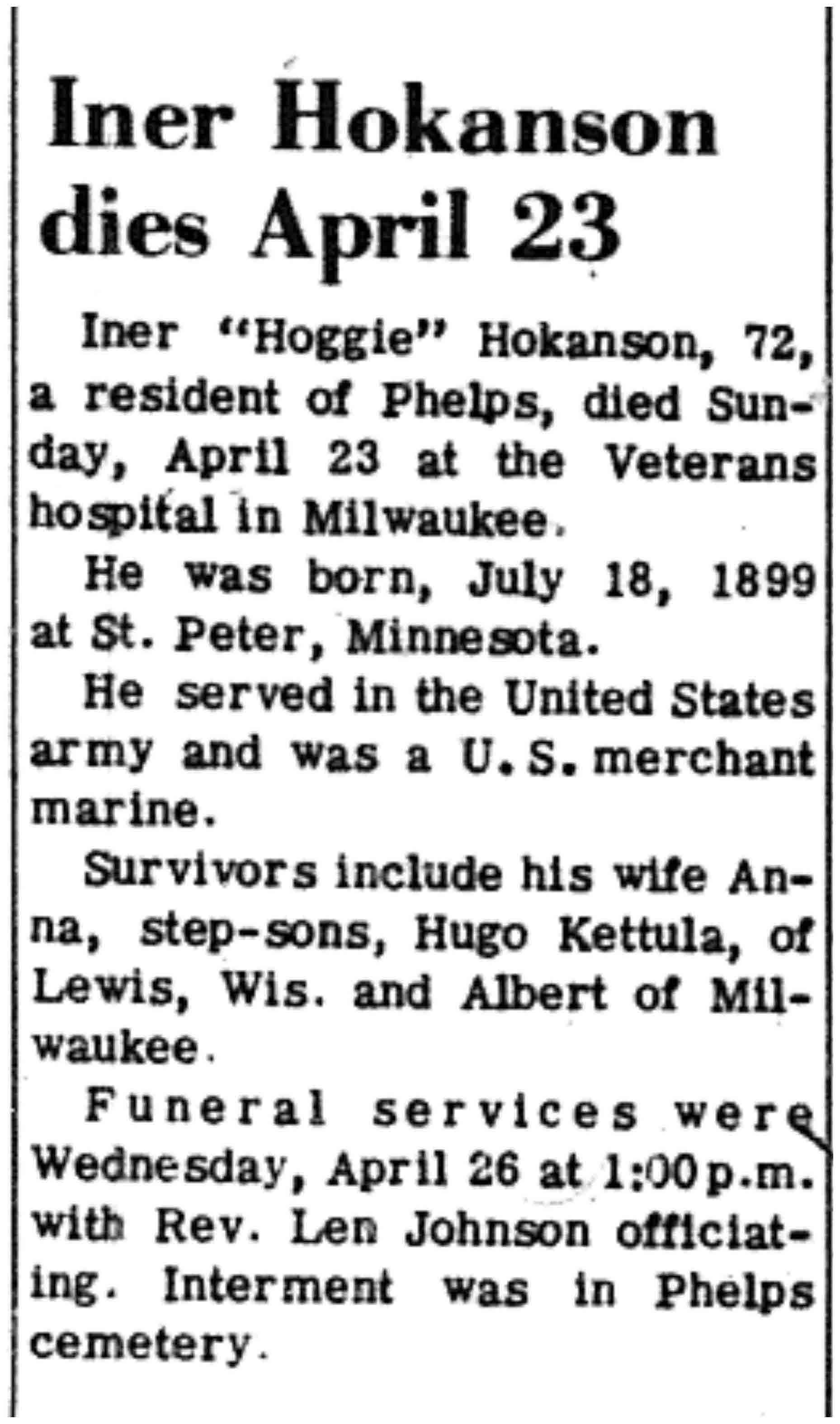| Hokanson | Iner 'Hoggie' | 18 Jul 1899 | 23 Apr 1972 | VCN | 27 Apr 1972 | 5 |