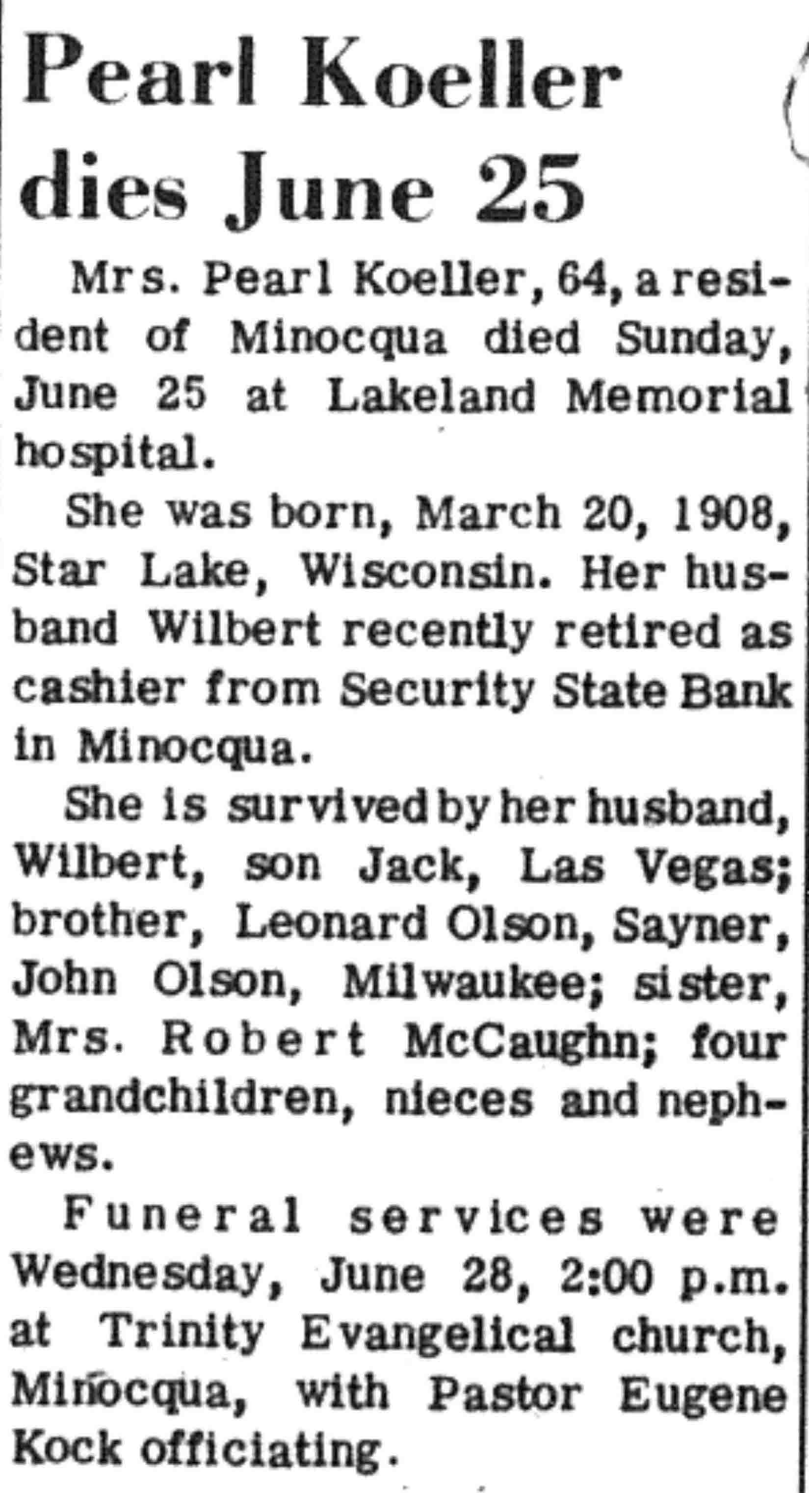 | Koeller | Pearl (Olson) | 20 Mar 1908 | 25 Jun 1972 | VCN | 29 Jun 1972 | 16 |