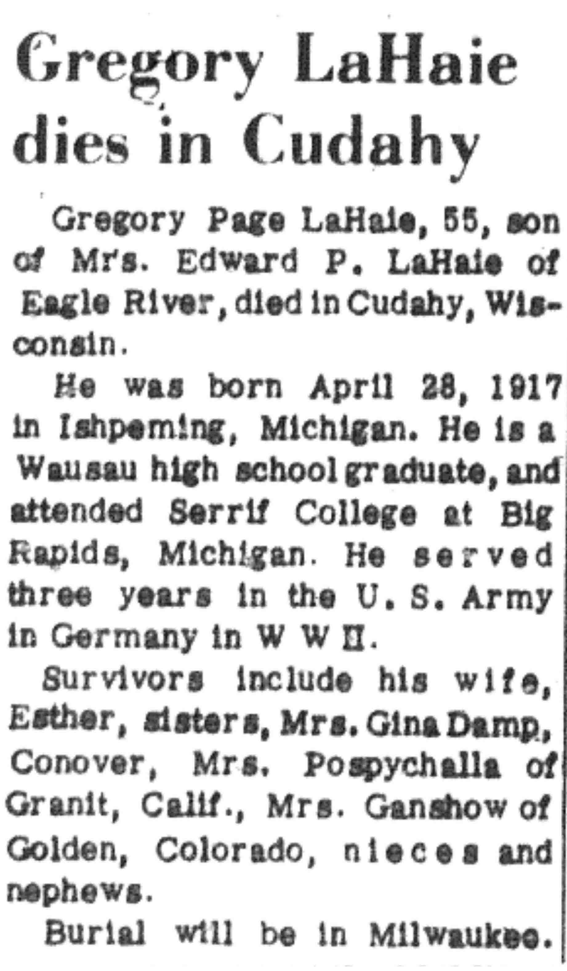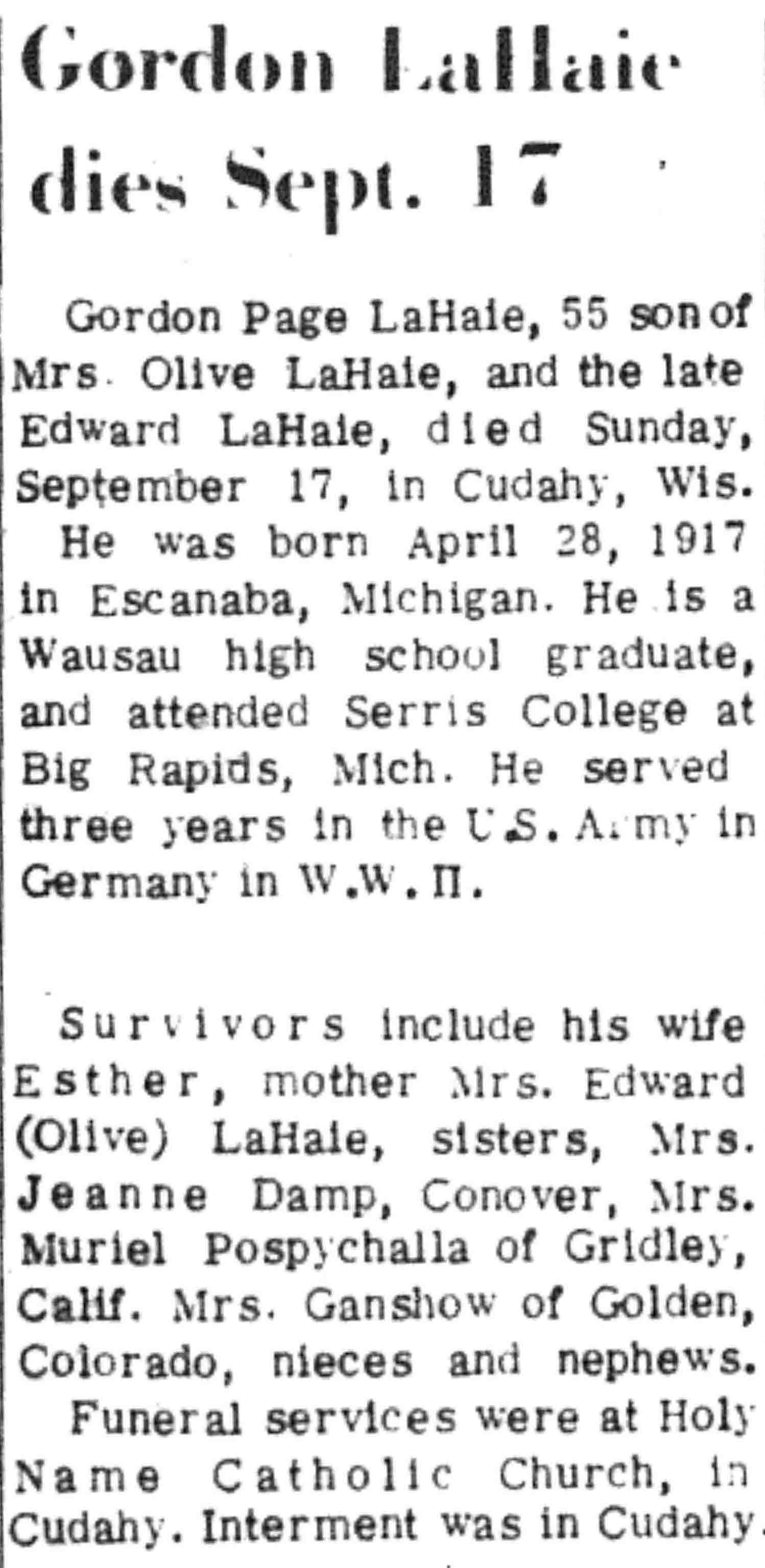 | LaHaie | Gordon Page | 28 Apr 1917 | 17 Sep 1972 | VCN | 28 Sep 1972 | 9 |