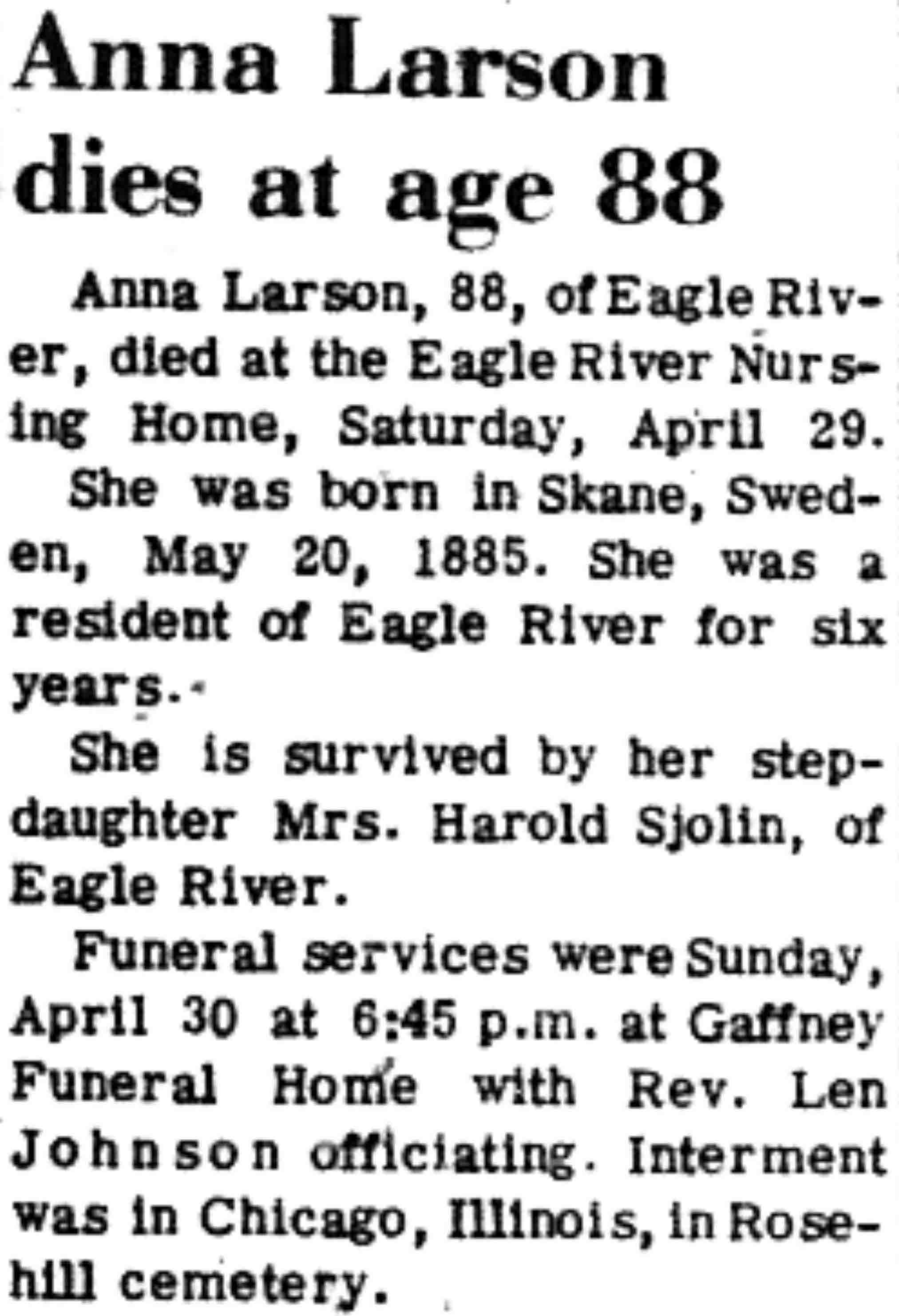 | Larson | Anna | 20 May 1885 | 29 Apr 1972 | VCN | 04 May 1972 | 3 |