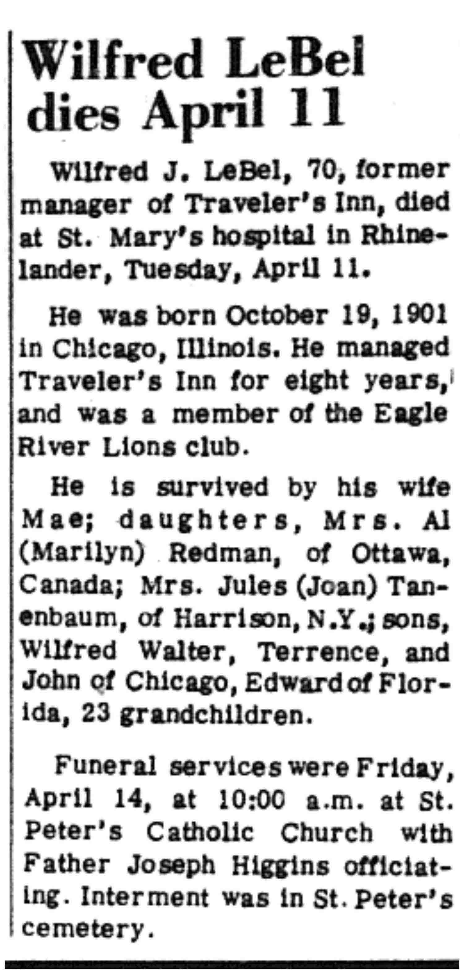 | LeBel | Wilfred J | 19 Oct 1901 | 11 Apr 1972 | VCN | 20 Apr 1972 | 8 |