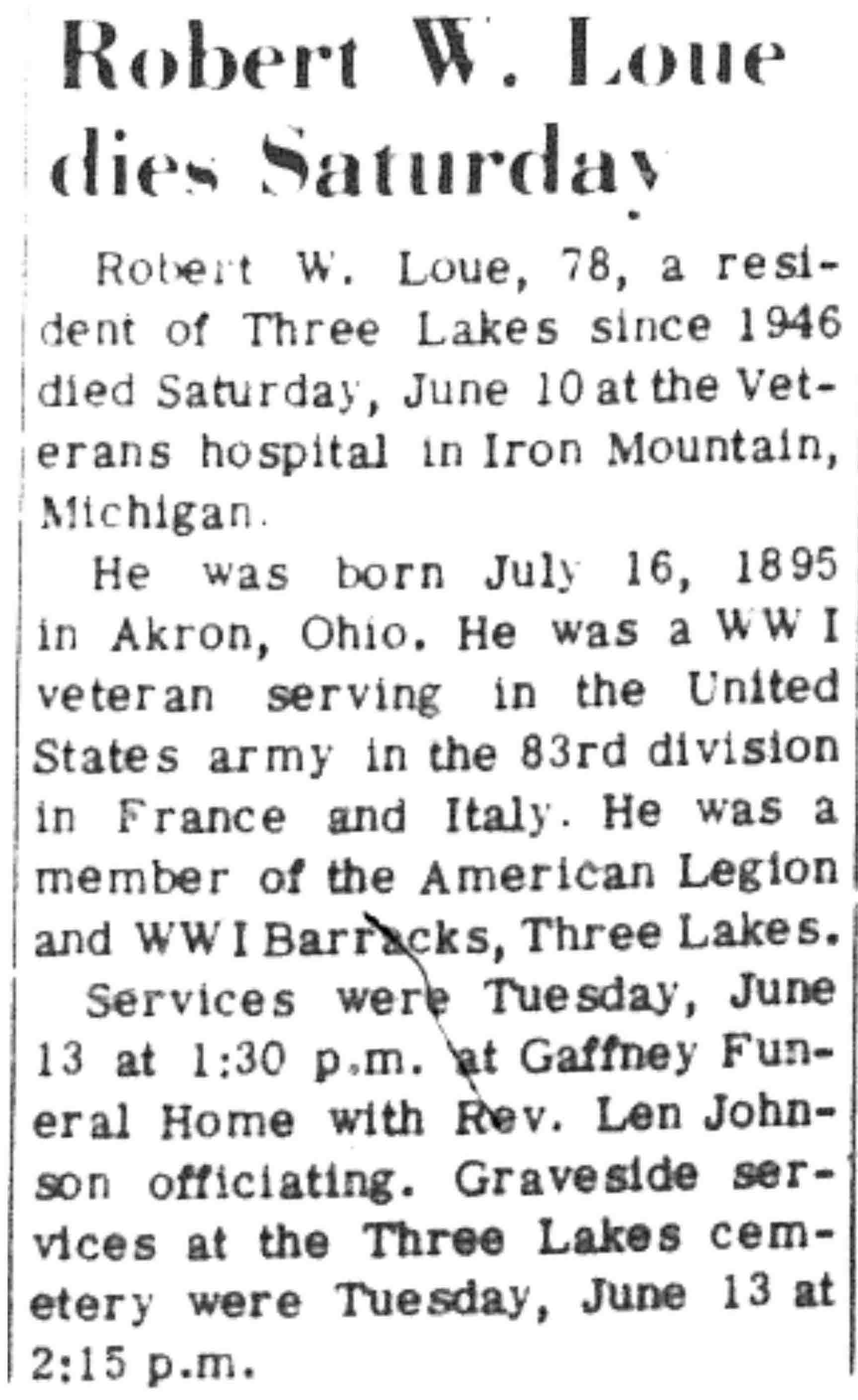 | Loue | Robert W | 16 Jul 1895 | 10 Jun 1972 | VCN | 15 Jun 1972 | 12 |