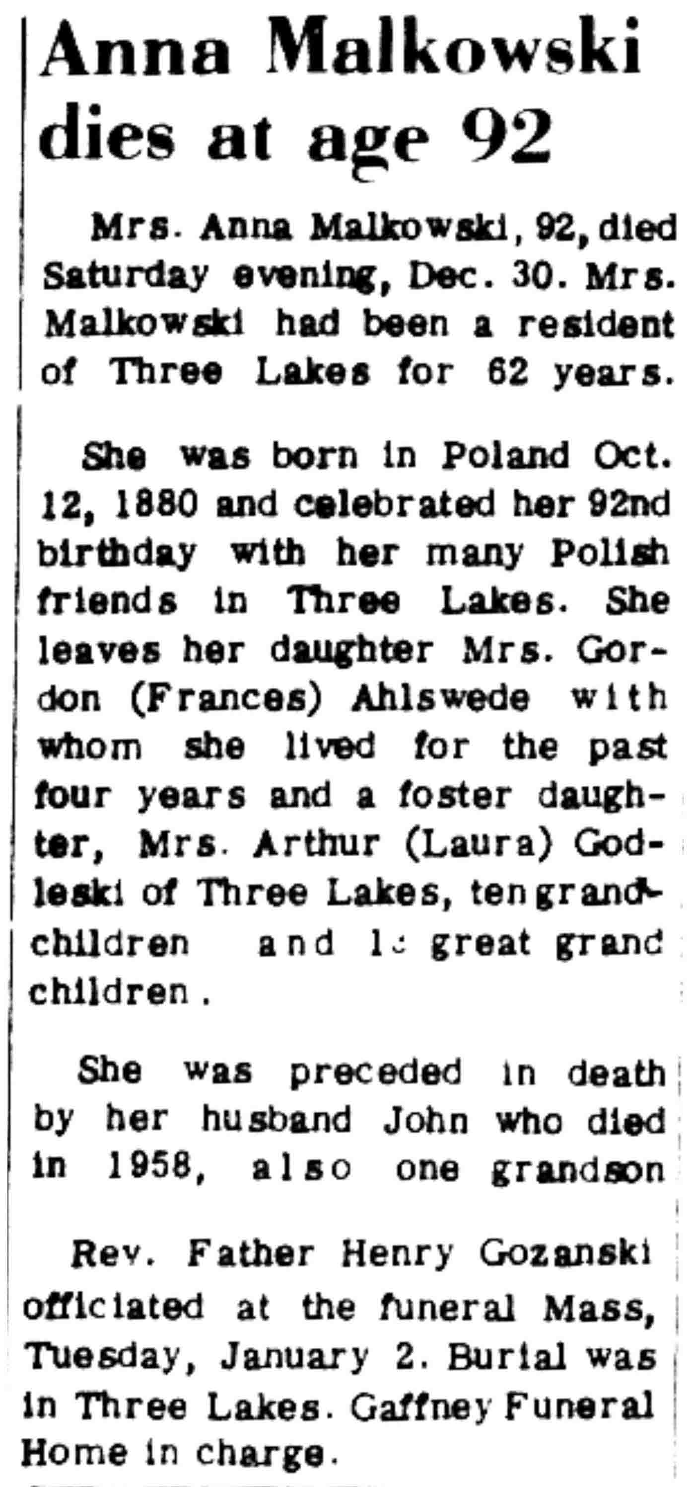 | Malkowski | Anna | 12 Oct 1880 | 30 Dec 1972 | VCN | 04 Jan 1973 | 3 |