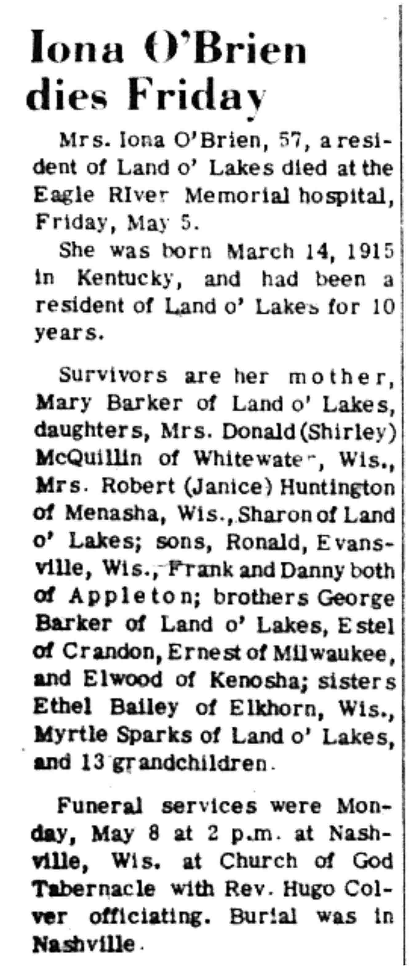 | O'Brien | Iona (Barker) | 14 Mar 1915 | 05 May 1972 | VCN | 11 May 1972 | 10 |