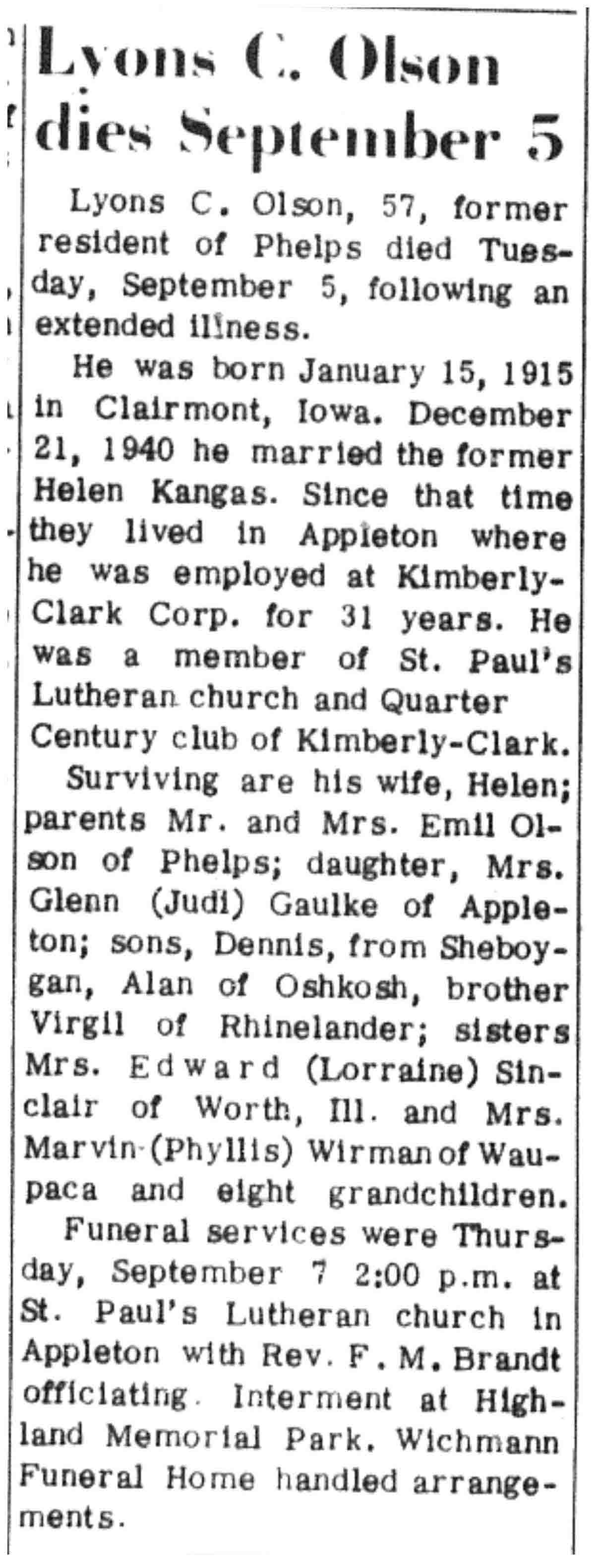 | Olson | Lyons C | 15 Jan 1915 | 05 Sep 1972 | VCN | 14 Sep 1972 | 3 |