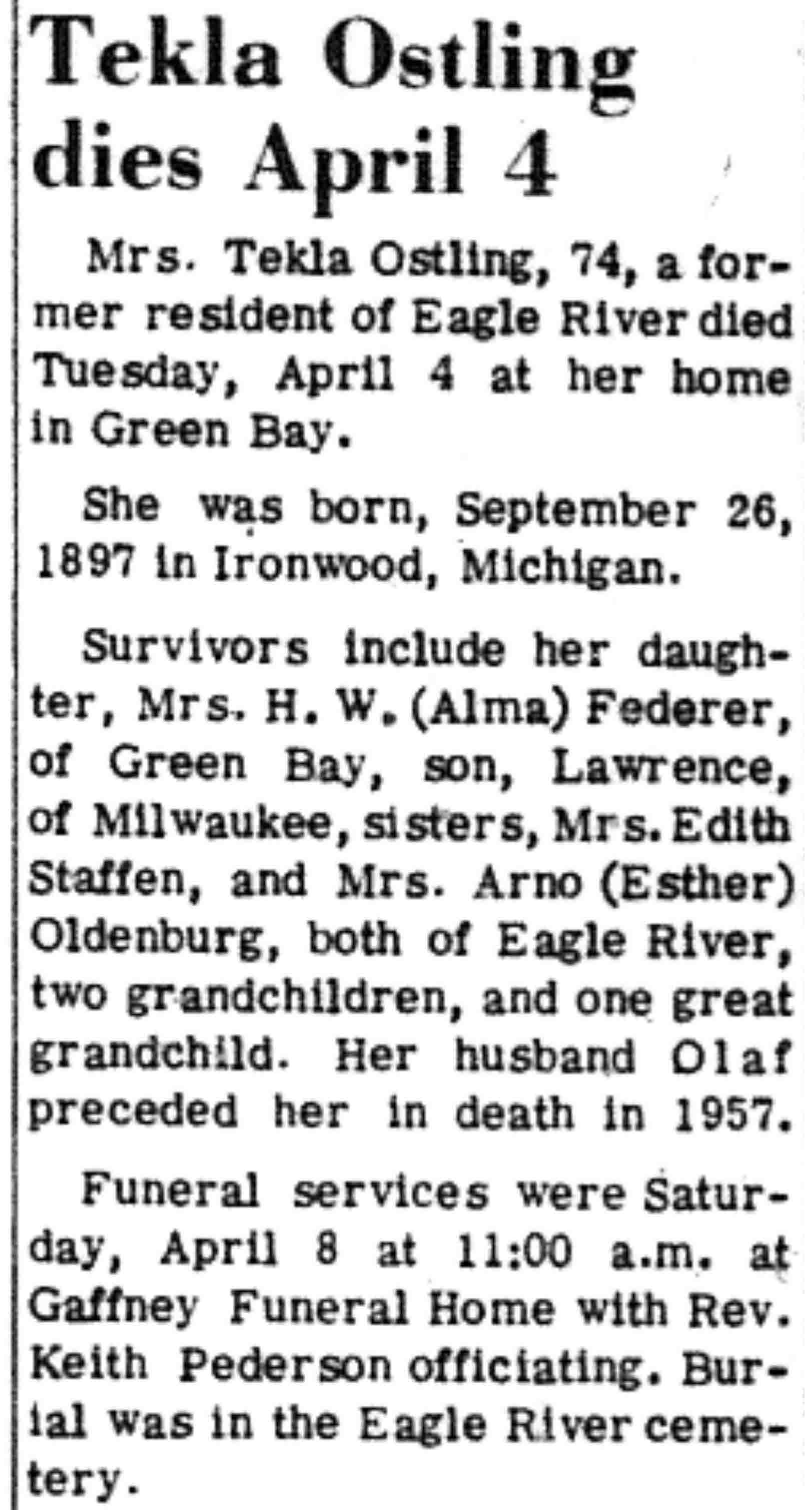 | Ostling | Tekla | 26 Sep 1897 | 04 Apr 1972 | VCN | 13 Apr 1972 | 9 |