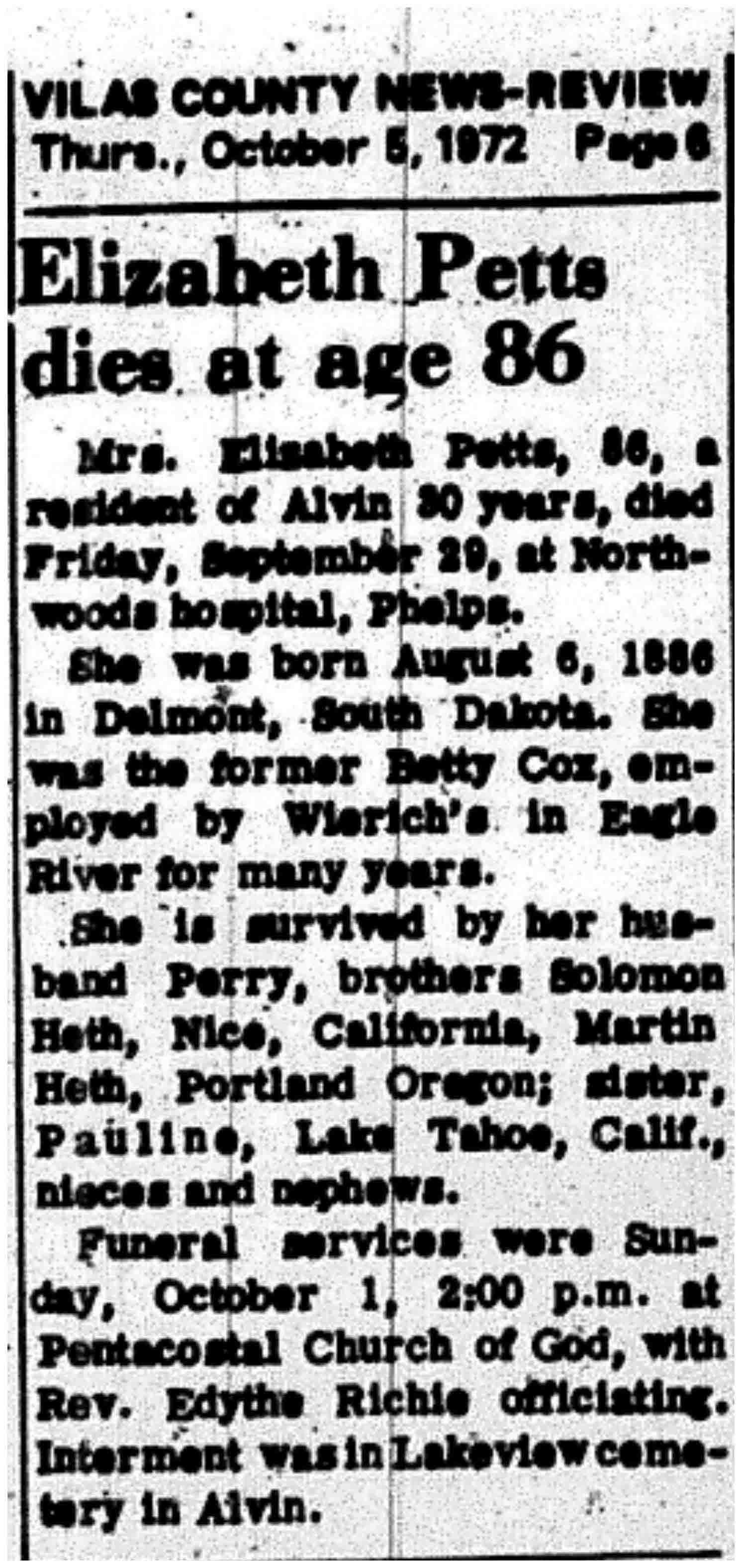 | Petts | Elizabeth (Cox) | 06 Aug 1886 | 20 Sep 1972 | VCN | 05 Oct 1972 | 6 |
