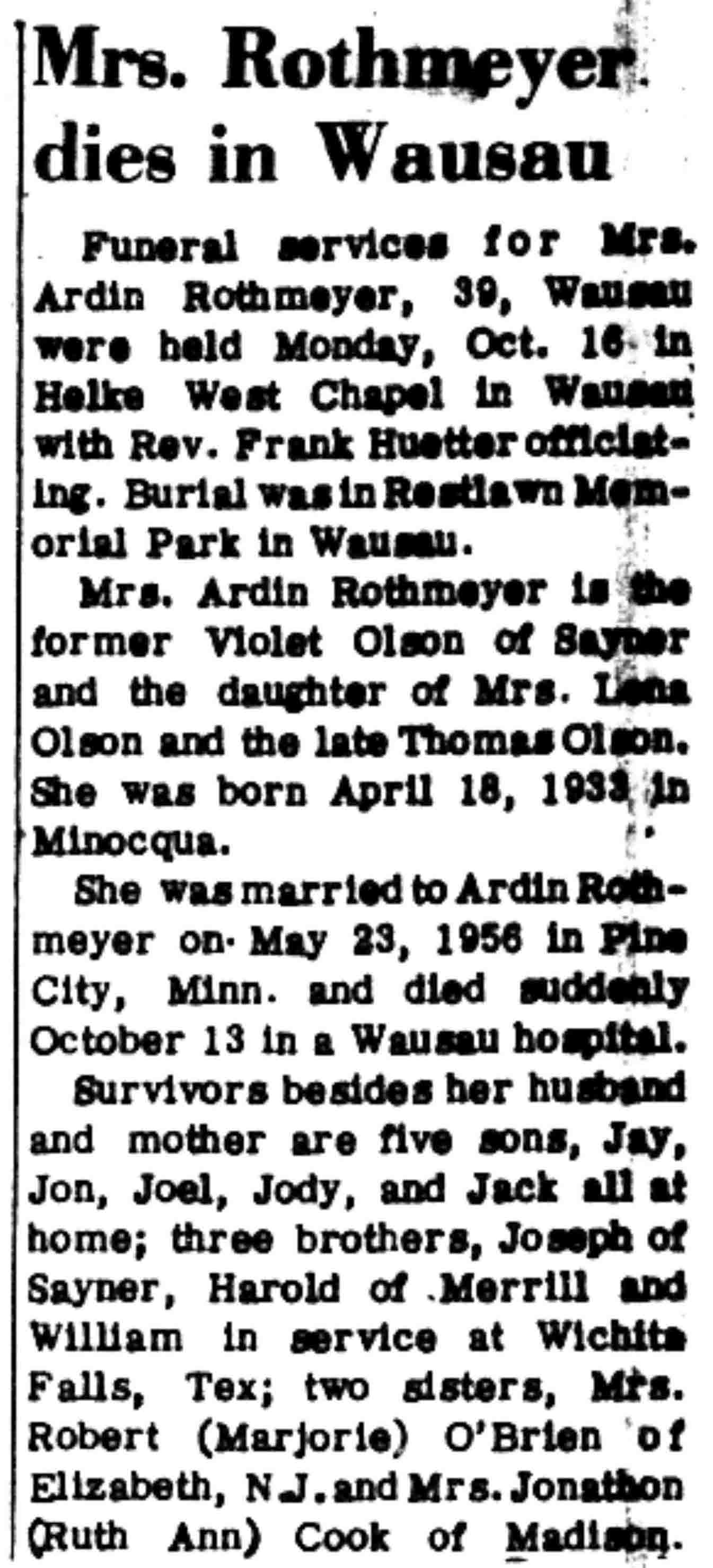 | Rothmeyer | Violet (Olson) | 18 Apr 1933 | 16 Oct 1972 | VCN | 26 Oct 1972 | 12 |
