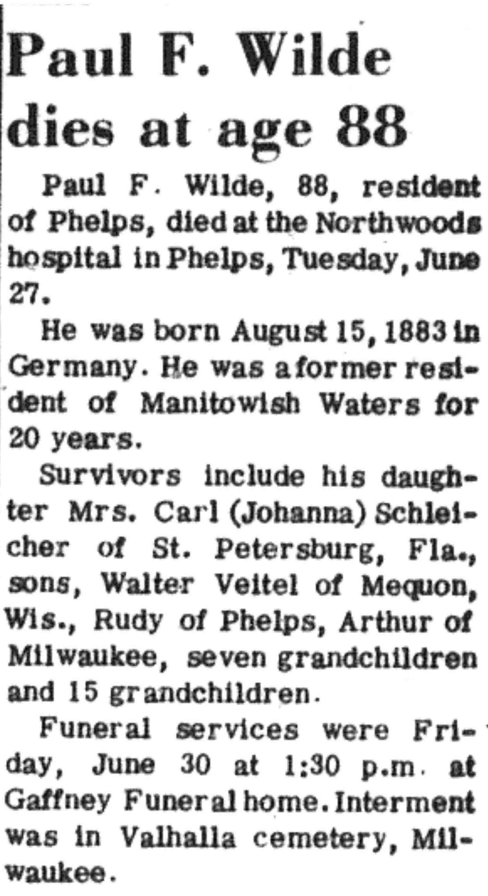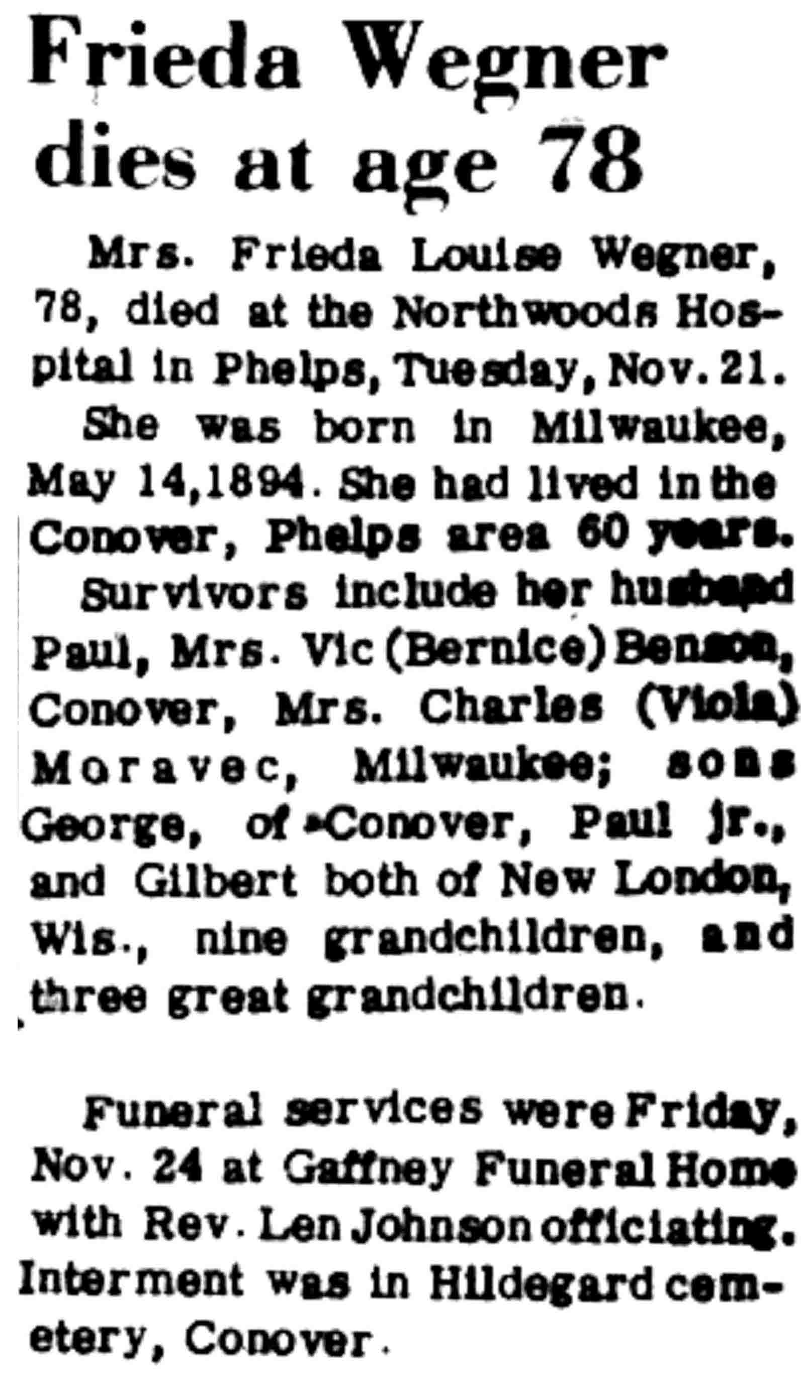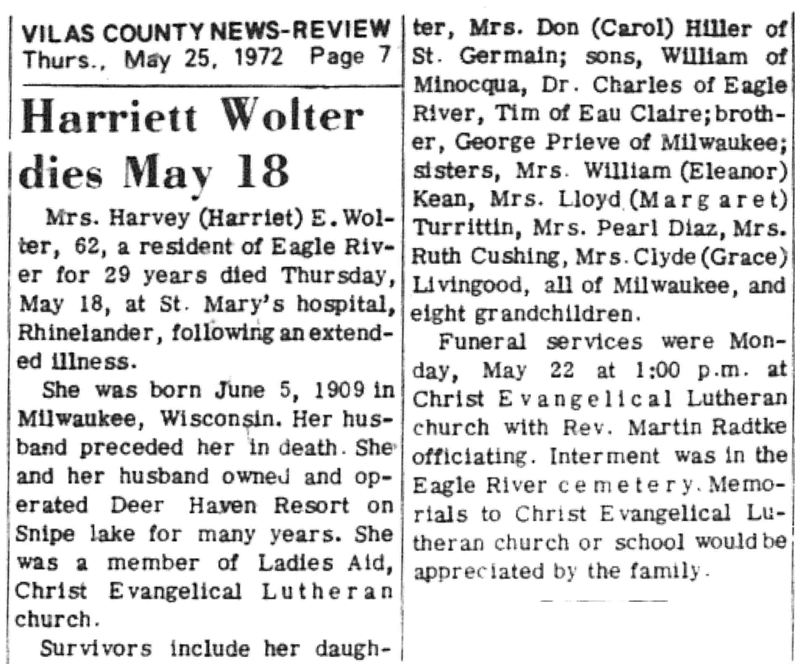 | Wolter | Harriett (Prieve) | 05 Jun 1909 | 18 May 1972 | VCN | 25 May 1972 | 7 |