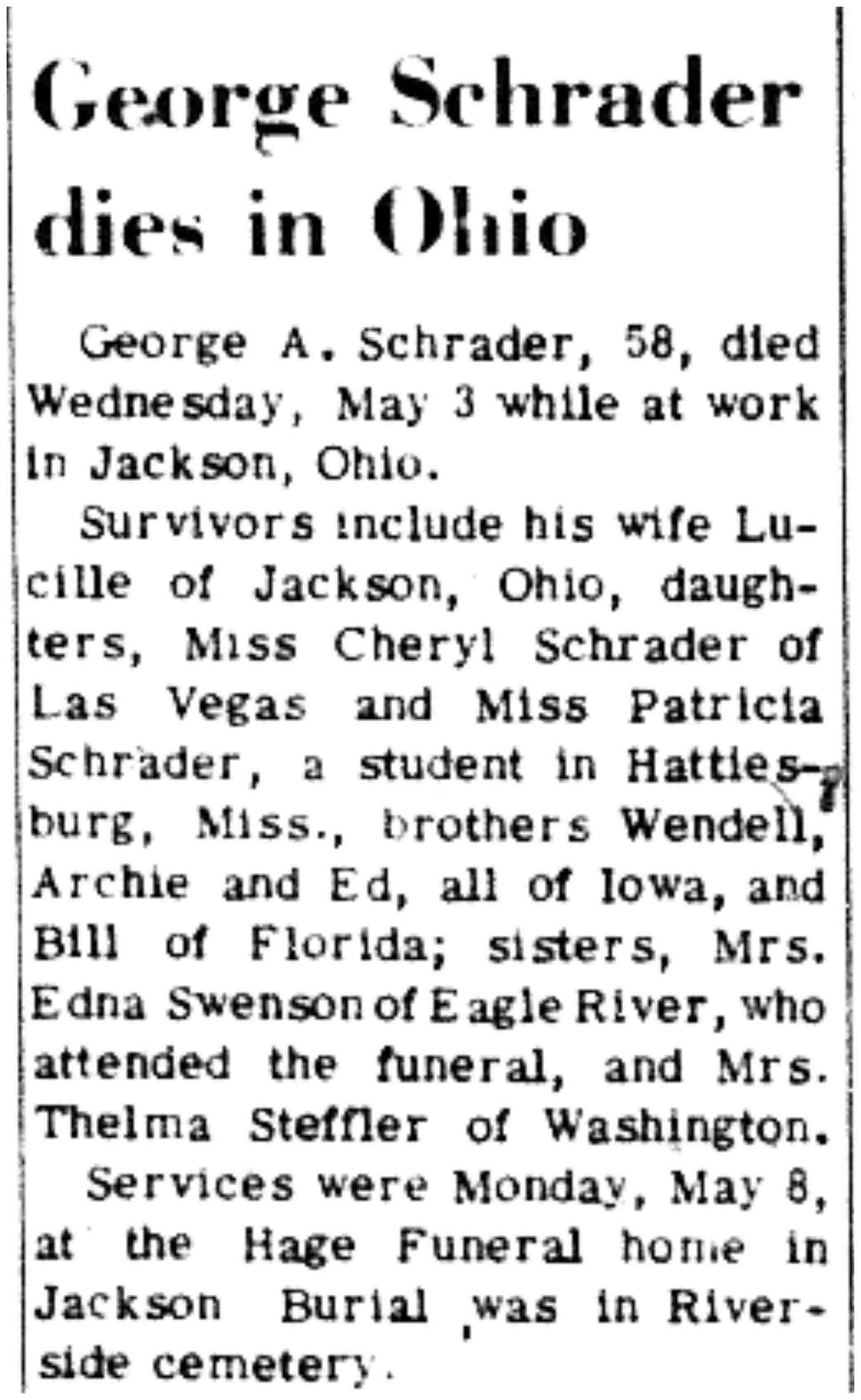 | Schrader | George A | c 1914 | 03 May 1972 | VCN | 18 May 1972 | 15 |