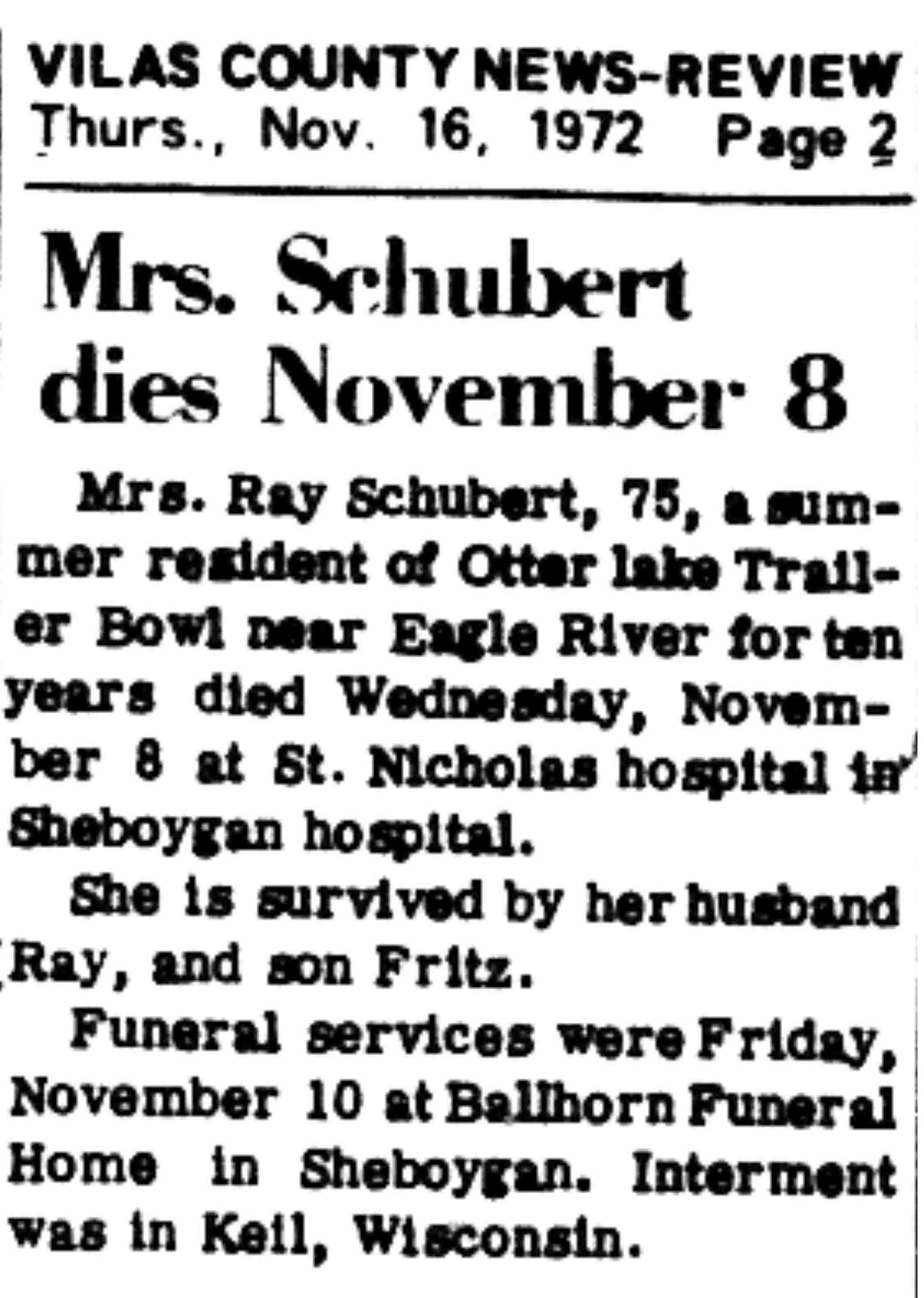 | Schubert | Ray, Mrs | c 1897 | 08 Nov 1972 | VCN | 16 Nov 1972 | 2 |