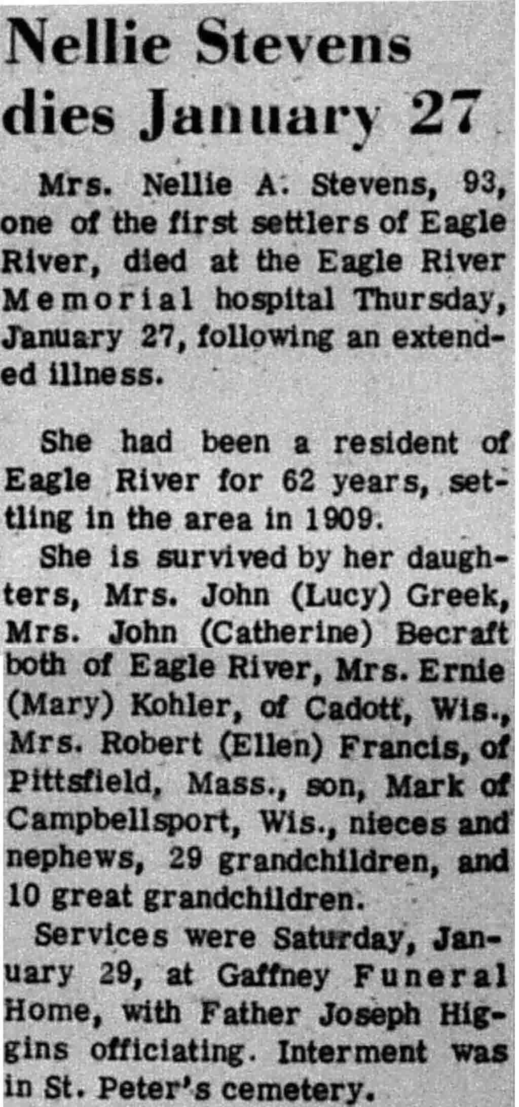 | Stevens | Nellie A | c 1909 | 27 Jan 1972 | VCN | 03 Feb 1972 | 3 |