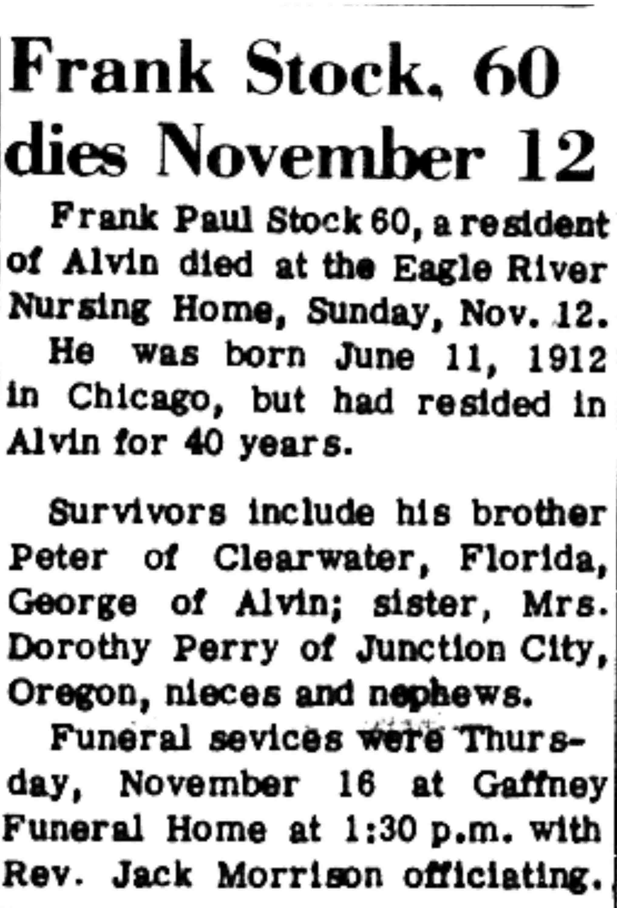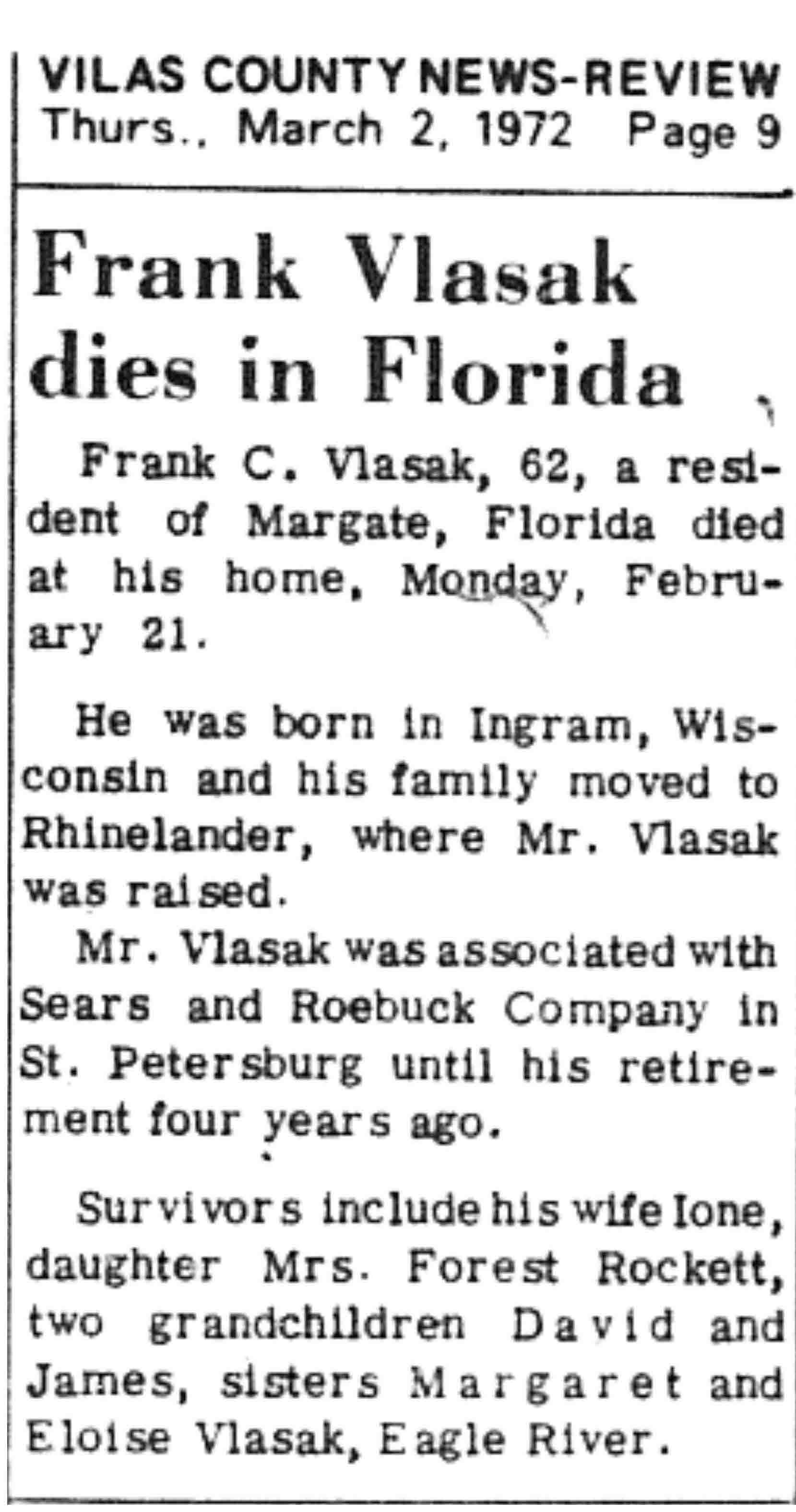 | Vlasak | Frank C | c 1910 | 21 Feb 1972 | VCN | 02 Mar 1972 | 9 |