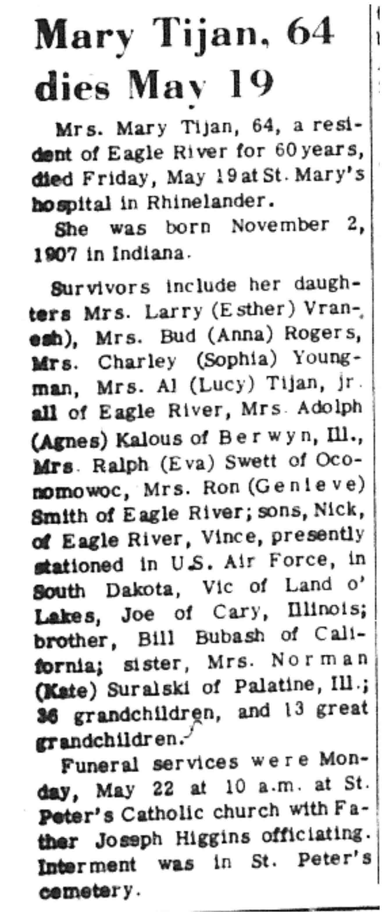| Tijan | Mary (Bubash) | 02 Nov 1902 | 19 May 1972 | VCN | 25 May 1972 | 3 |