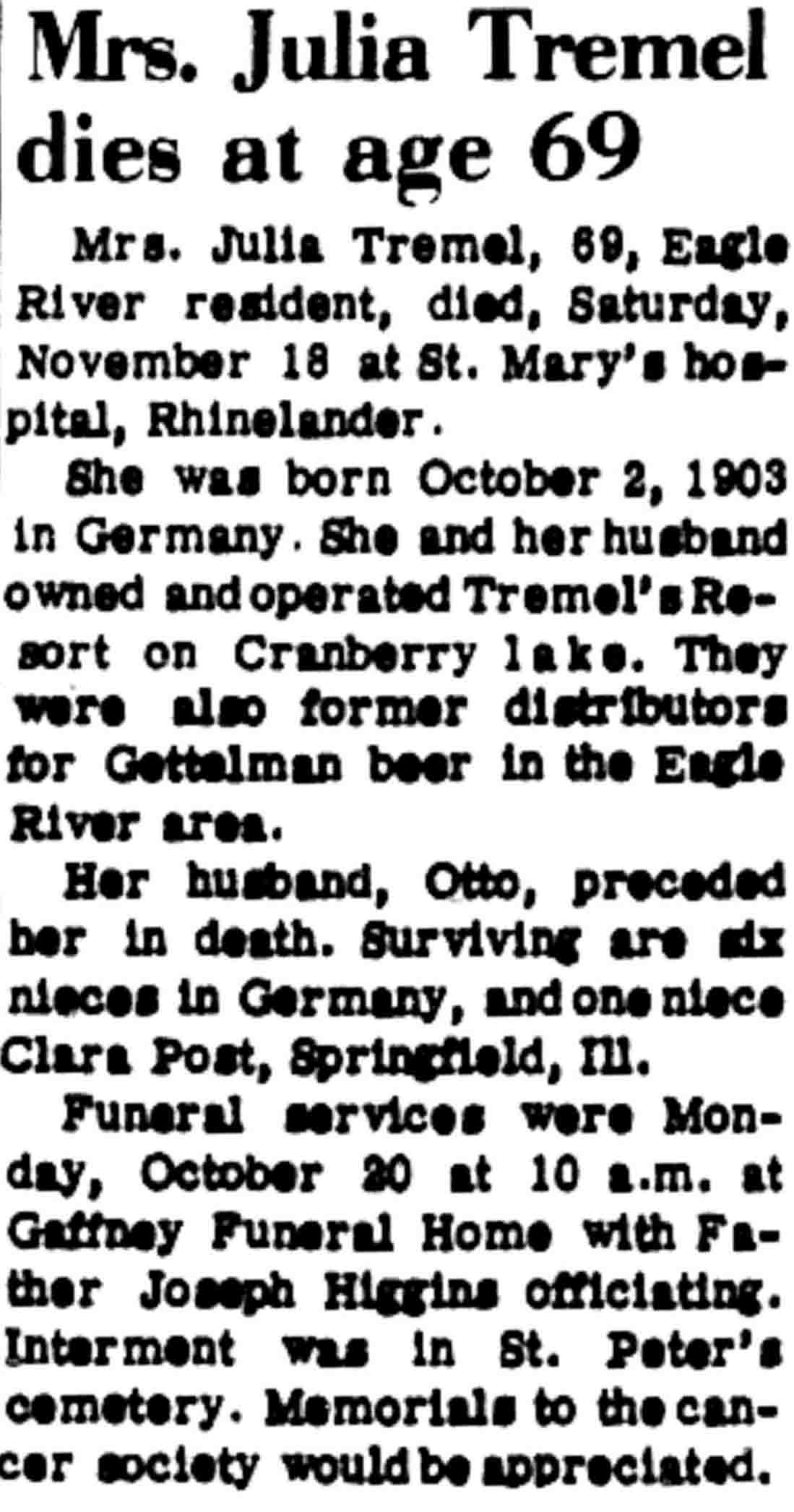 | Tremel | Julia | 02 Oct 1903 | 18 Nov 1972 | VCN | 23 Nov 1972 | 5 |