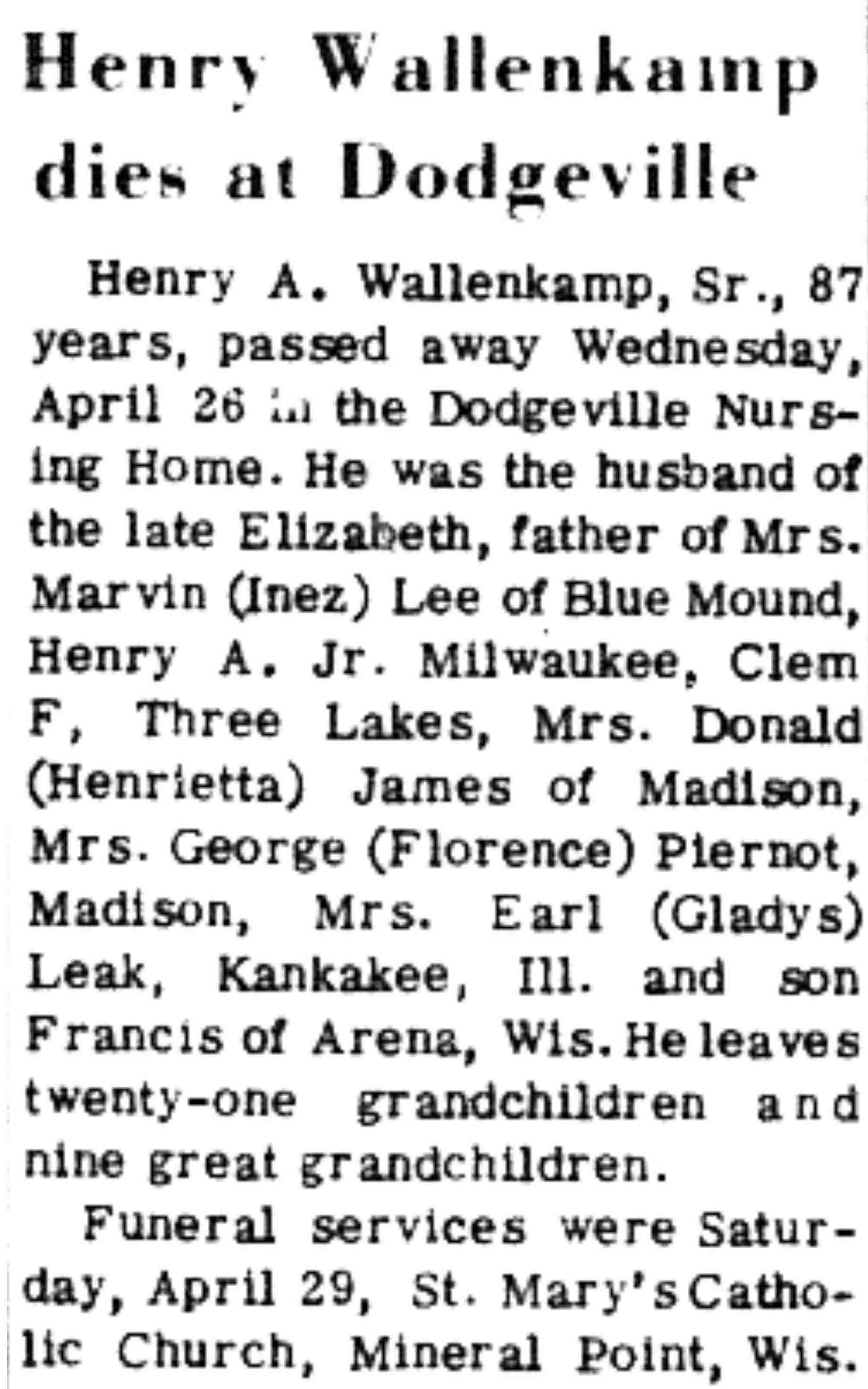 | Wallenkamp | Henry A | c 1885 | 26 Apr 1972 | VCN | 04 May 1972 | 9 |