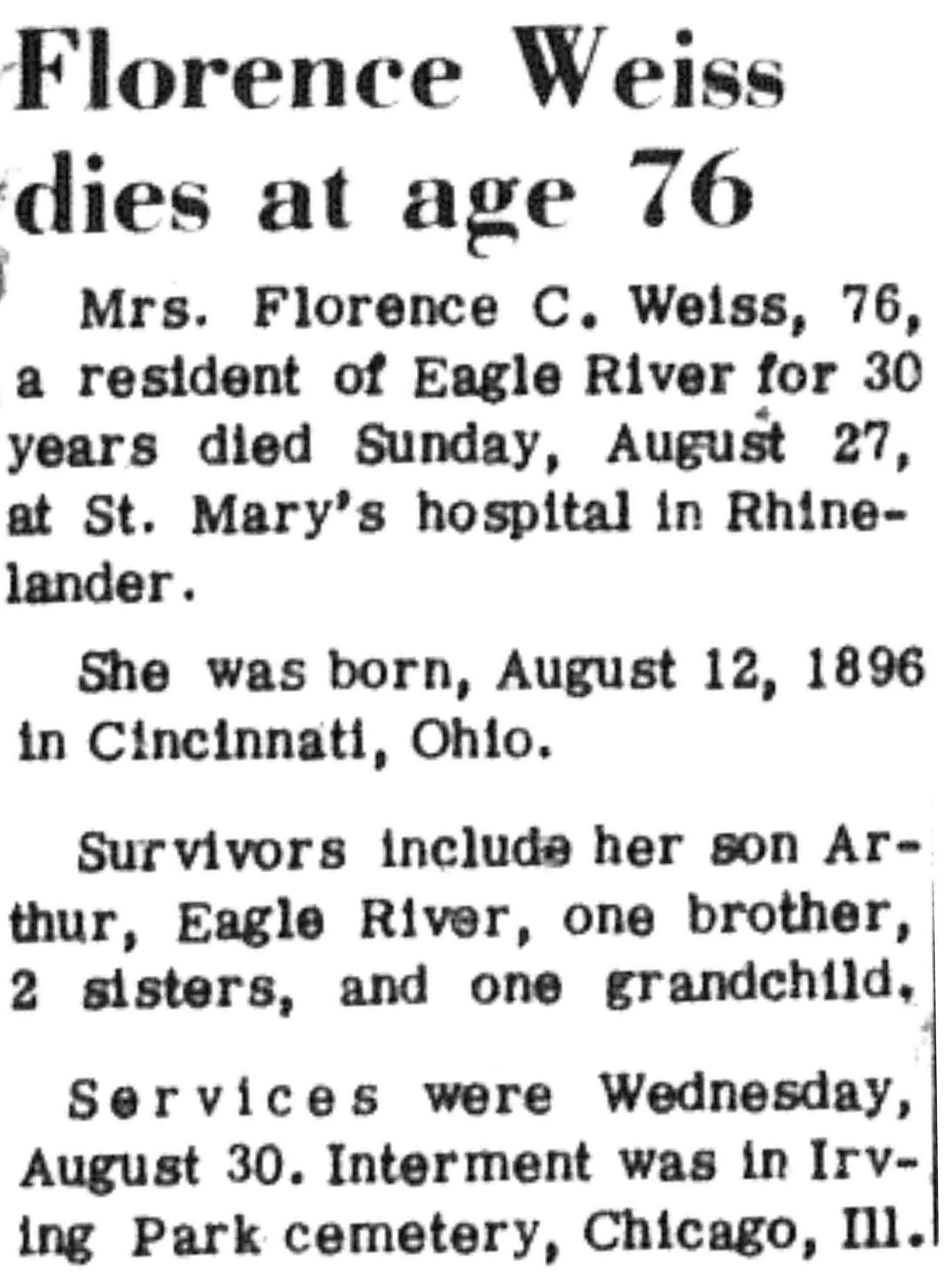 | Weiss | Florence C | 12 Aug 1896 | 27 Aug 1972 | VCN | 31 Aug 1972 | 2 |