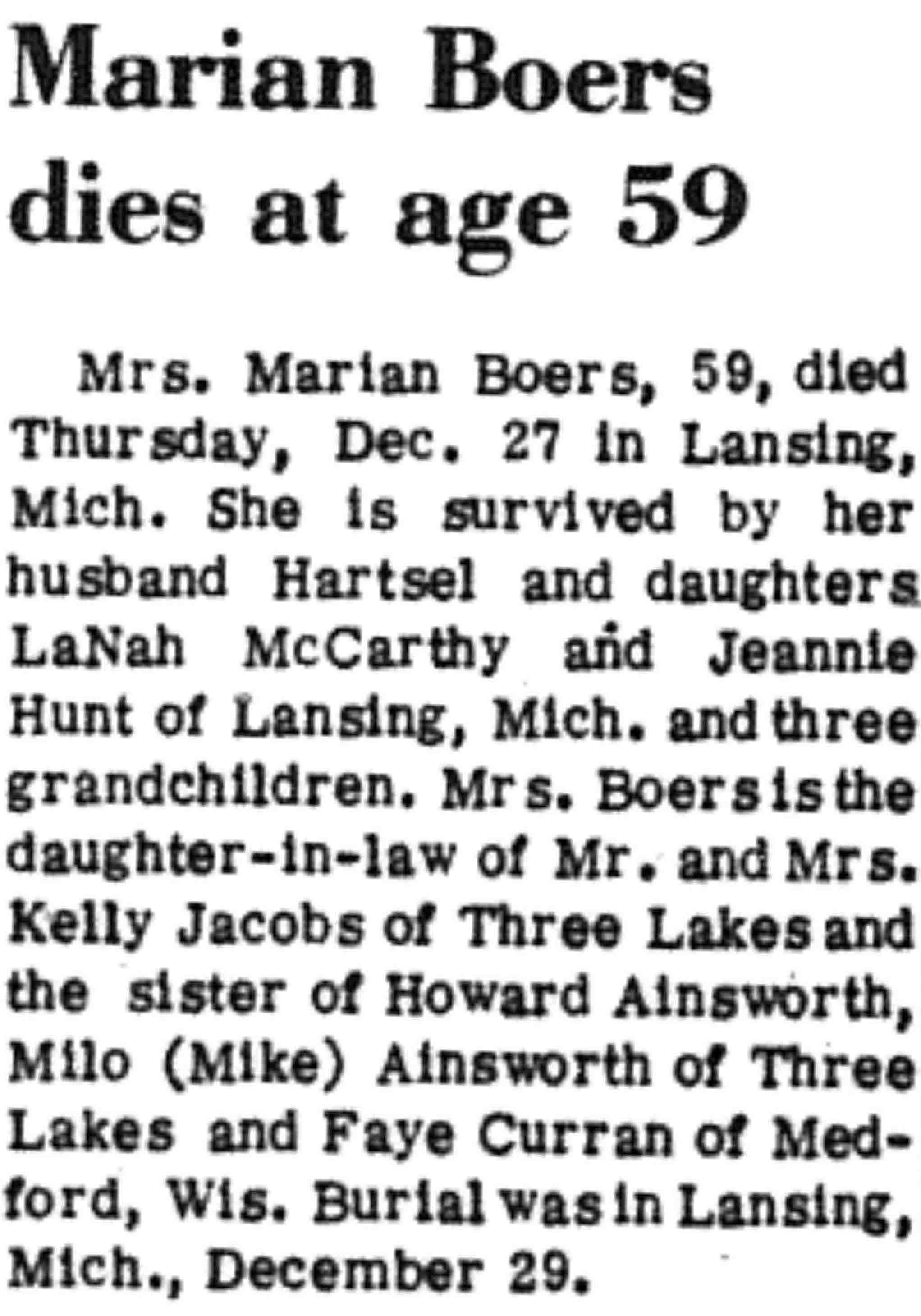 | Boers | Marian (Ainsworth) | c 1914 | 27 Dec 1973 | VCN | 10 Jan 1974 | 9 |