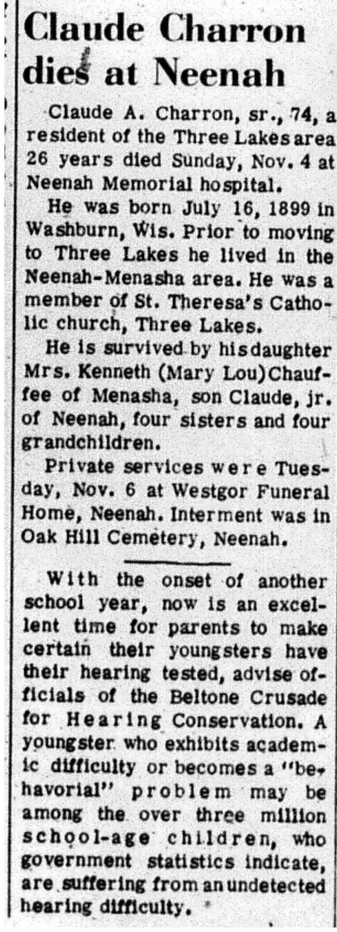 | Charron | Claude A, Sr | 16 Jul 1899 | 04 Nov 1973 | VCN | 08 Nov 1973 | 3 |