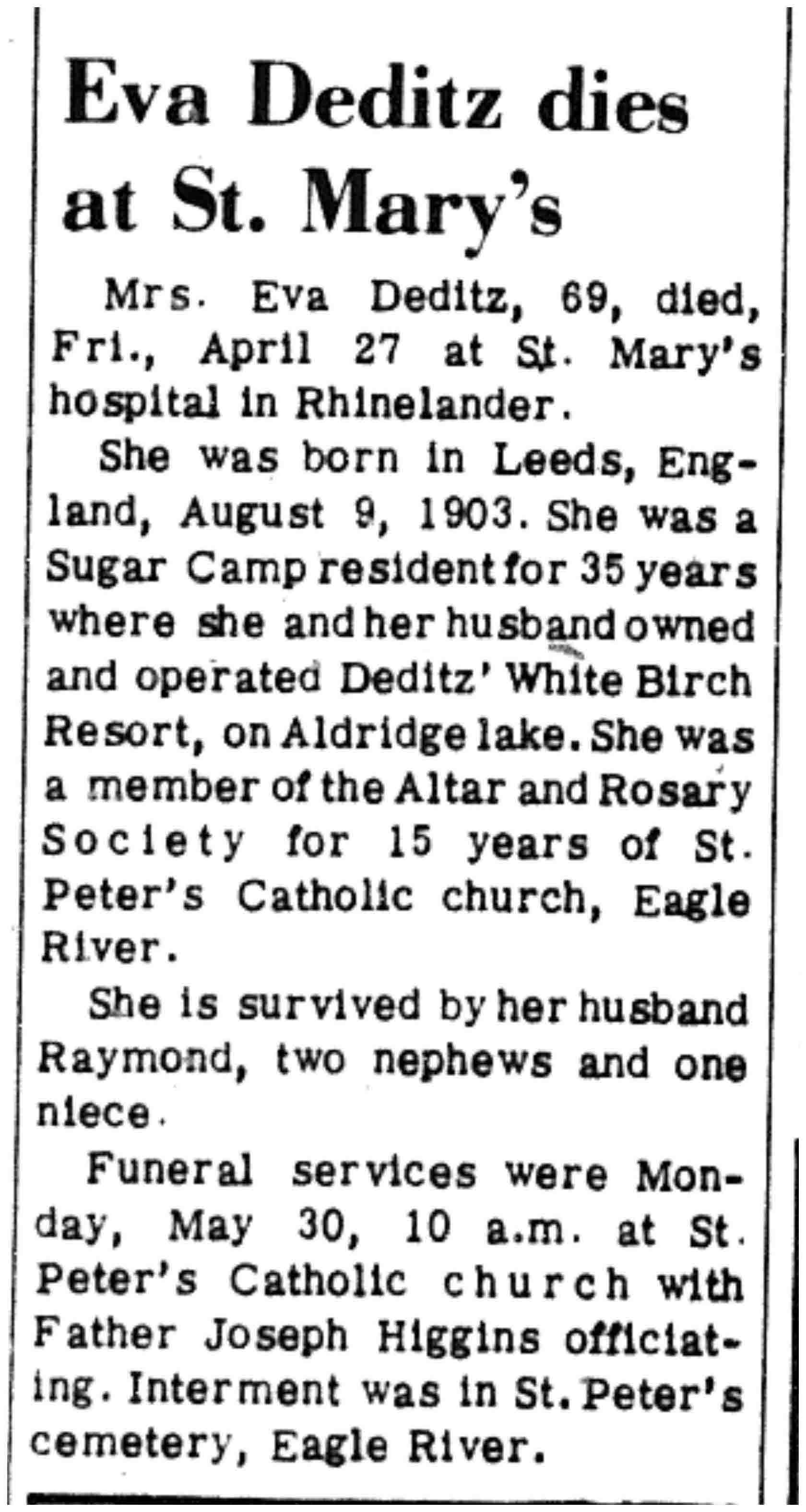 | Deditz | Eva | 09 Aug 1903 | 27 Apr 1973 | VCN | 03 May 1973 | 8 |