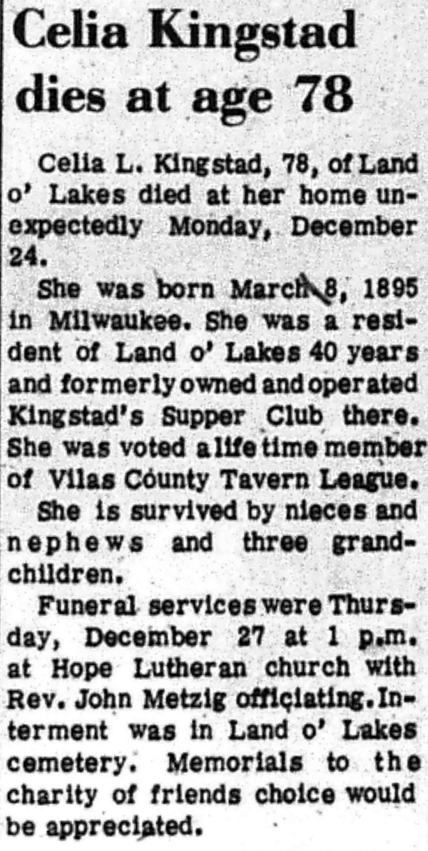 | Kingstad | Celia L | 08 Mar 1895 | 24 Dec 1973 | VCN | 03 Jan 1974 | 7 |