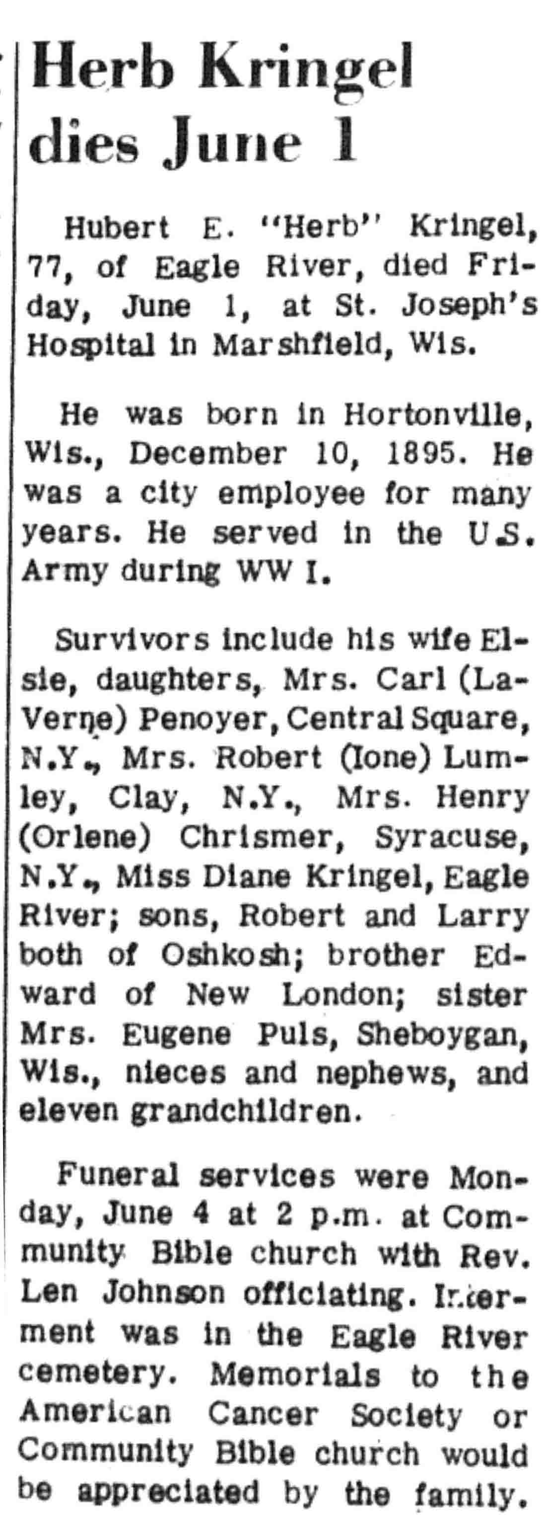 | Kringel | Hubert E 'Herb' | 10 Dec 1895 | 01 Jun 1973 | VCN | 07 Jun 1973 | 3 |