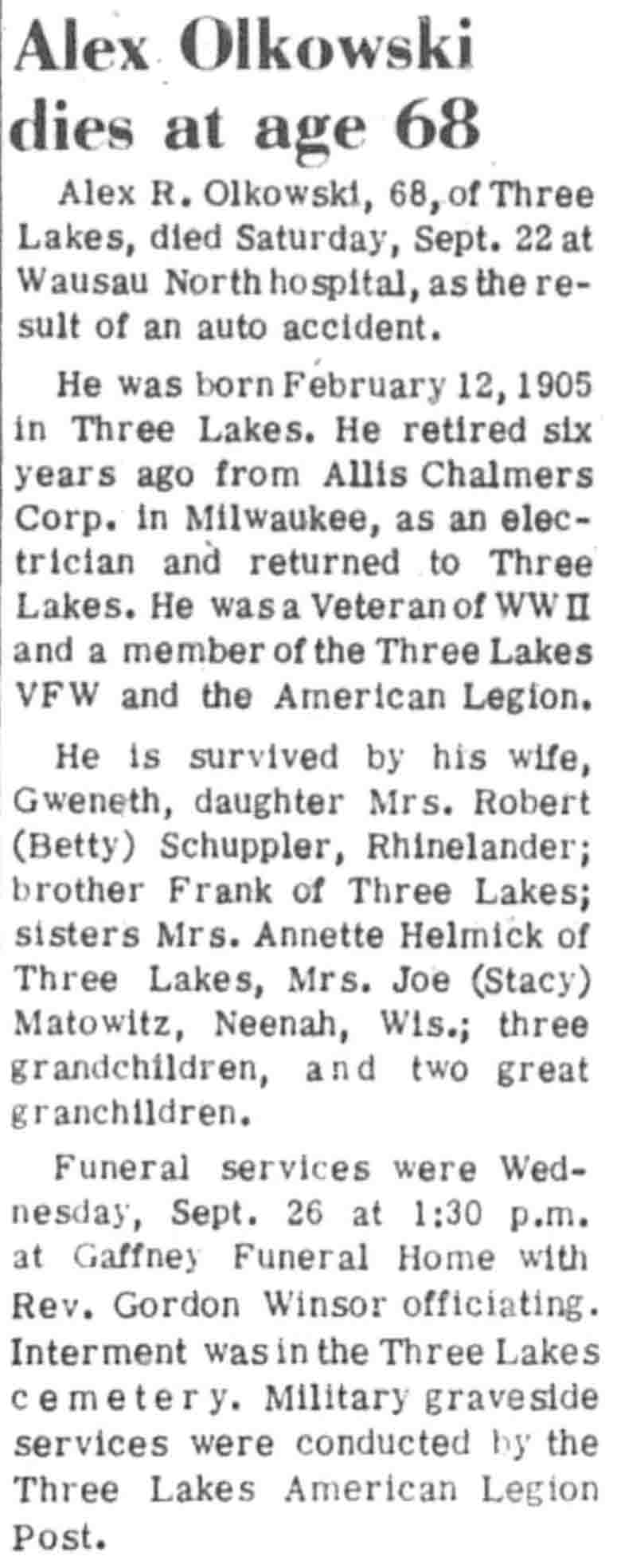 | Olkowski | Alex R | 12 Feb 1905 | 22 Sep 1973 | VCN | 27 Sep 1973 | 11 |