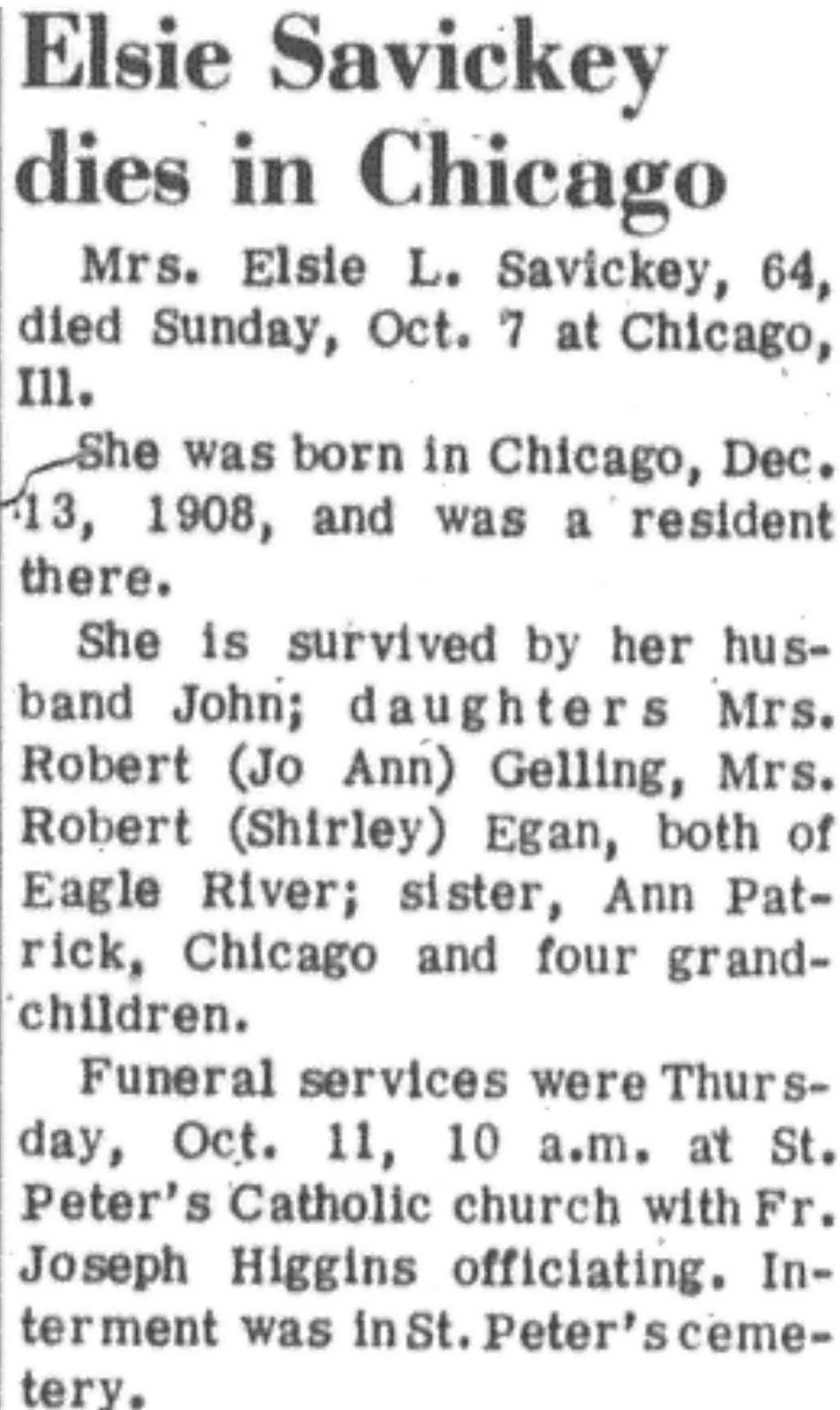 | Savickey | Elsie L | 13 Dec 1908 | 07 Oct 1973 | VCN | 11 Oct 1973 | 7 |