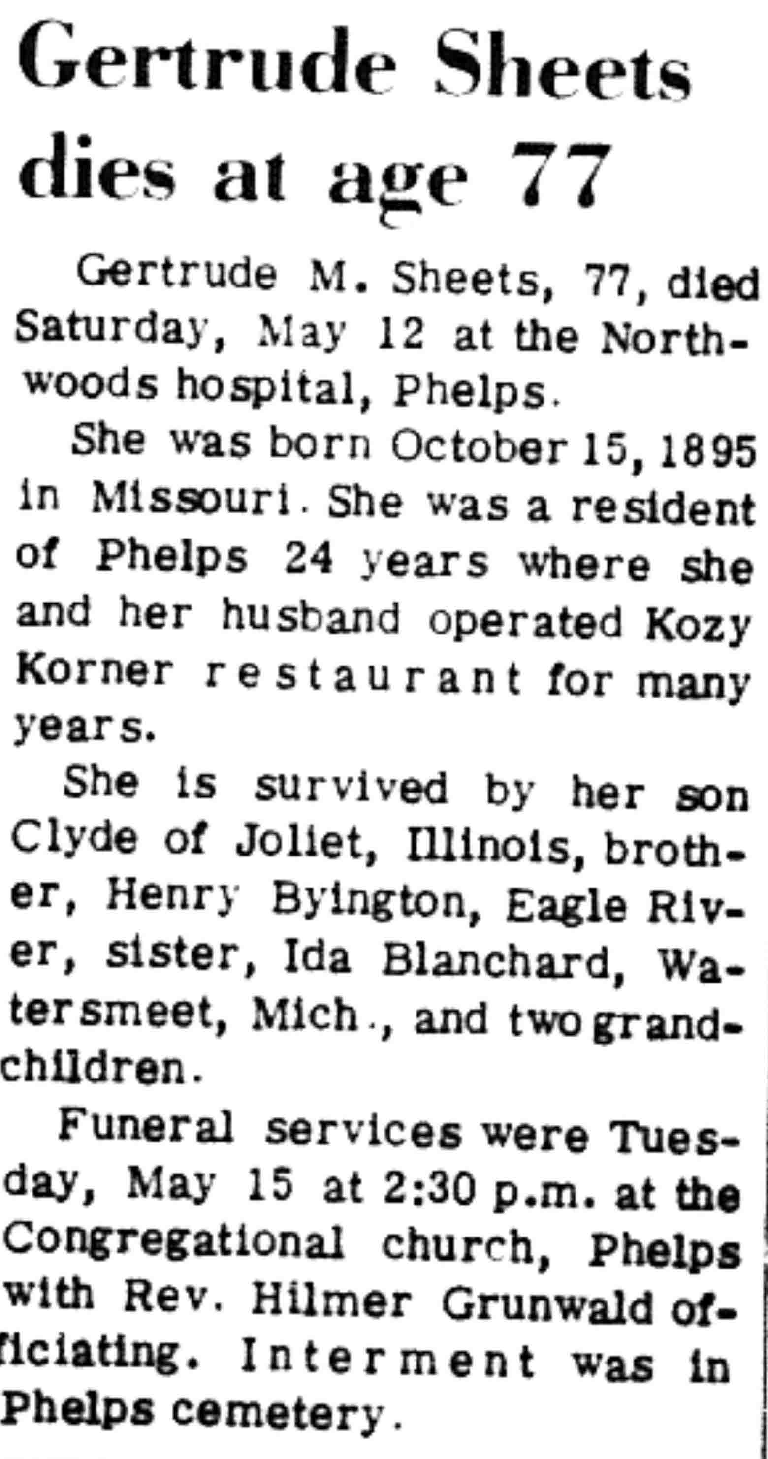 | Sheets | Gertrude M (Byington) | 15 Oct 1895 | 12 May 1973 | VCN | 17 May 1973 | 13 |