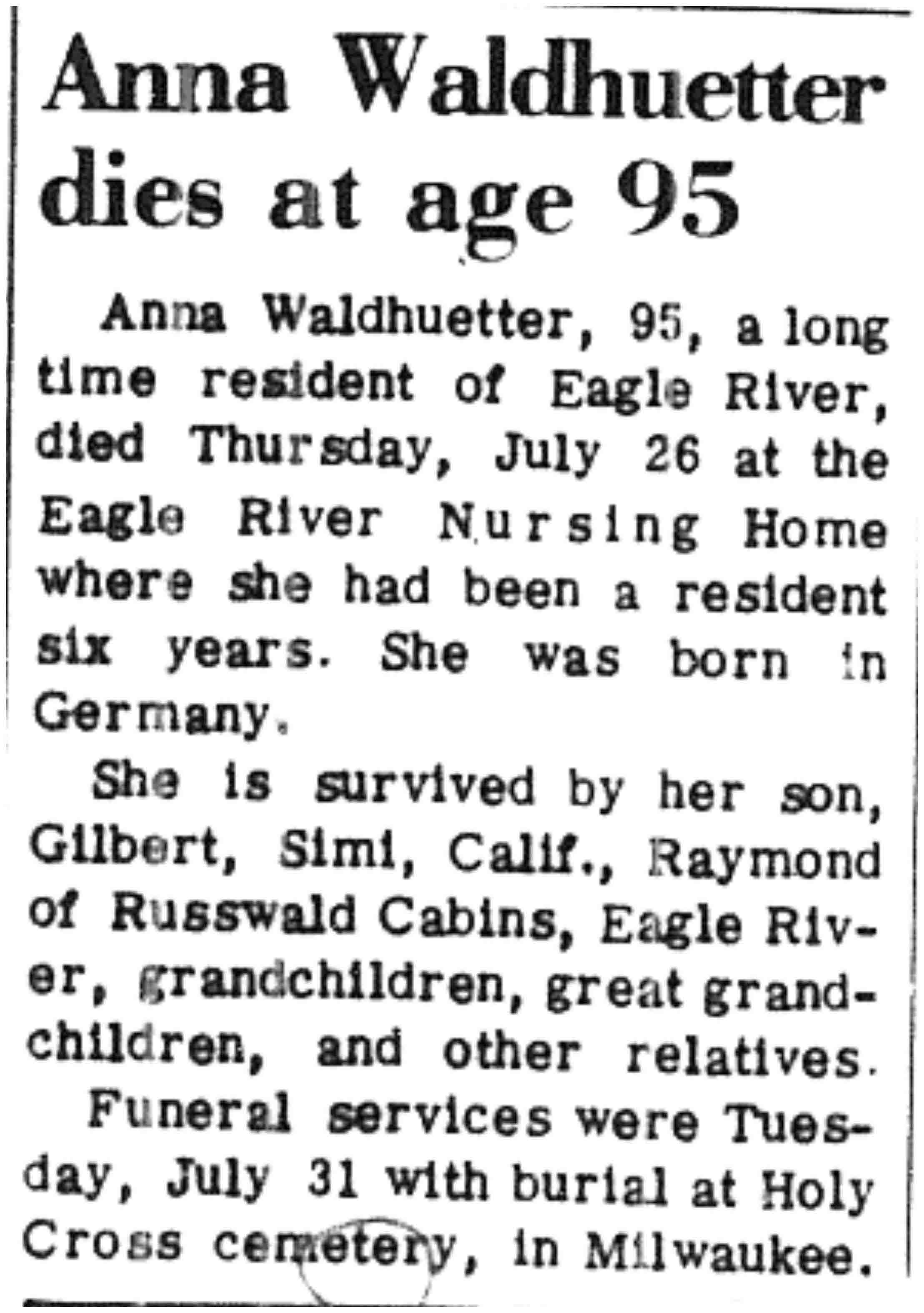 | Waldhuetter | Anna | c 1878 | 26 Jul 1973 | VCN | 02 Aug 1973 | 8 |