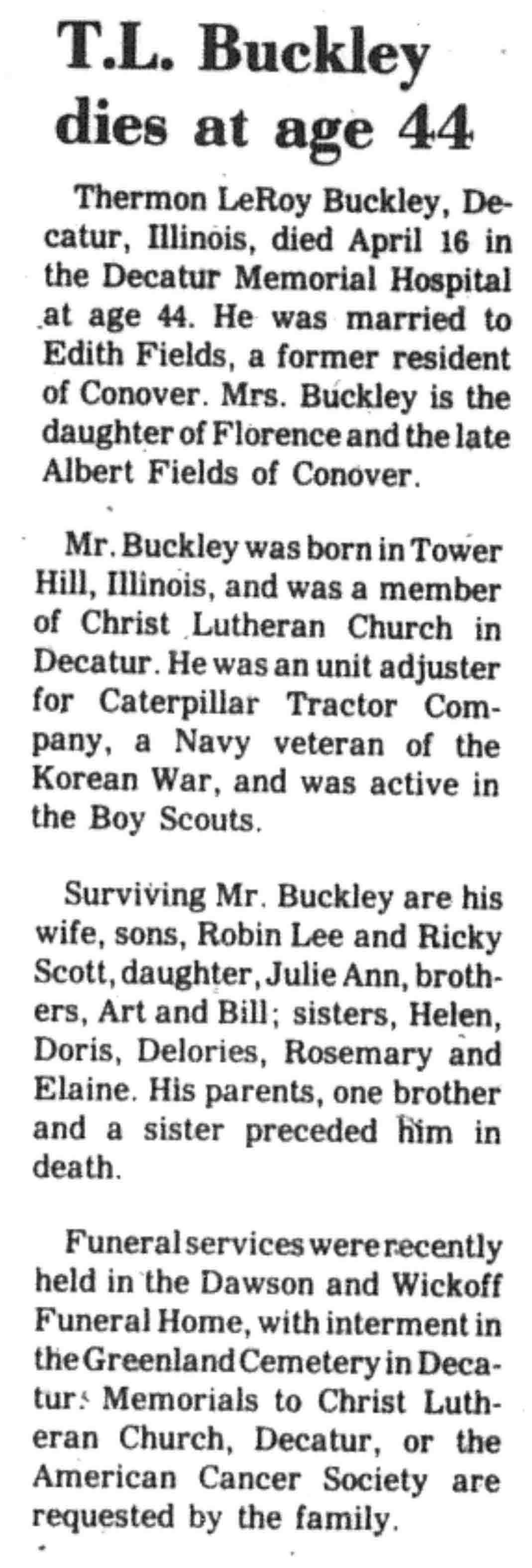 | Buckley | Thermon LeRoy | c 1933 | 16 Apr 1977 | VCN | 05 May 1977 | 4 |