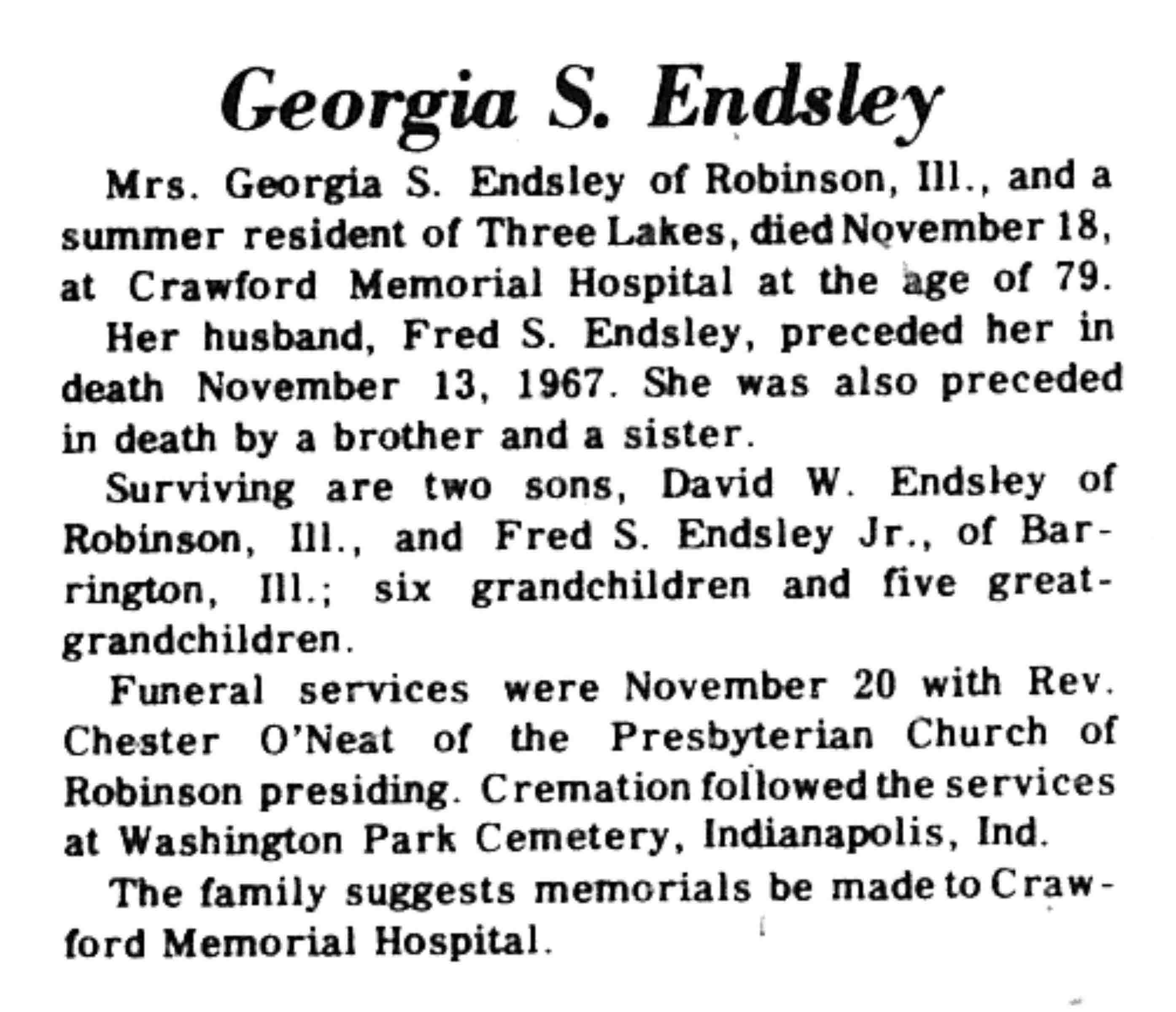 | Endsley | Georgia S | c 1898 | 18 Nov 1977 | VCN | 08 Dec 1977 | 4 |