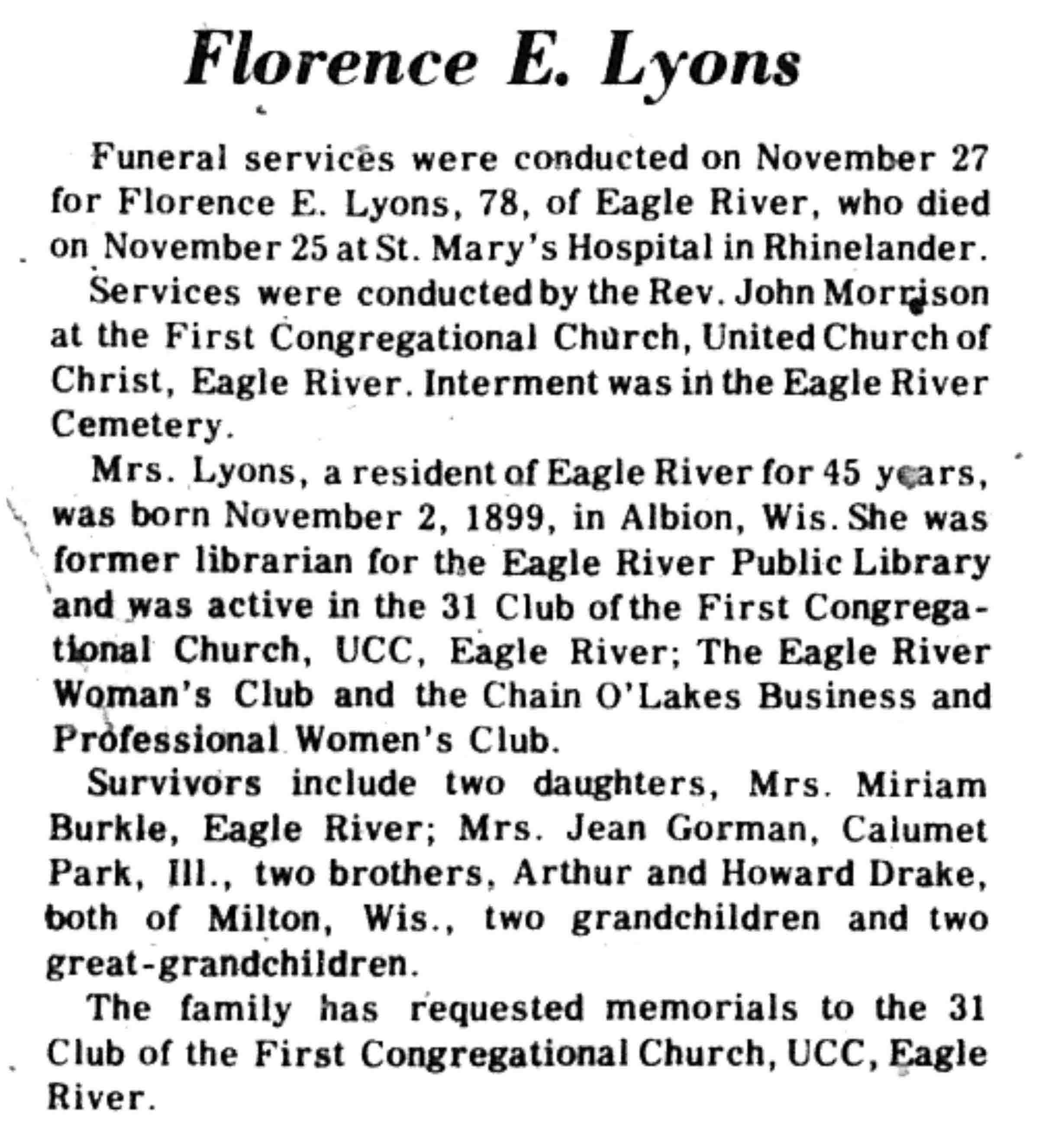 | Lyons | Florence E (Drake) | 02 Nov 1899 | 25 Nov 1977 | VCN | 01 Dec 1977 | 15 |