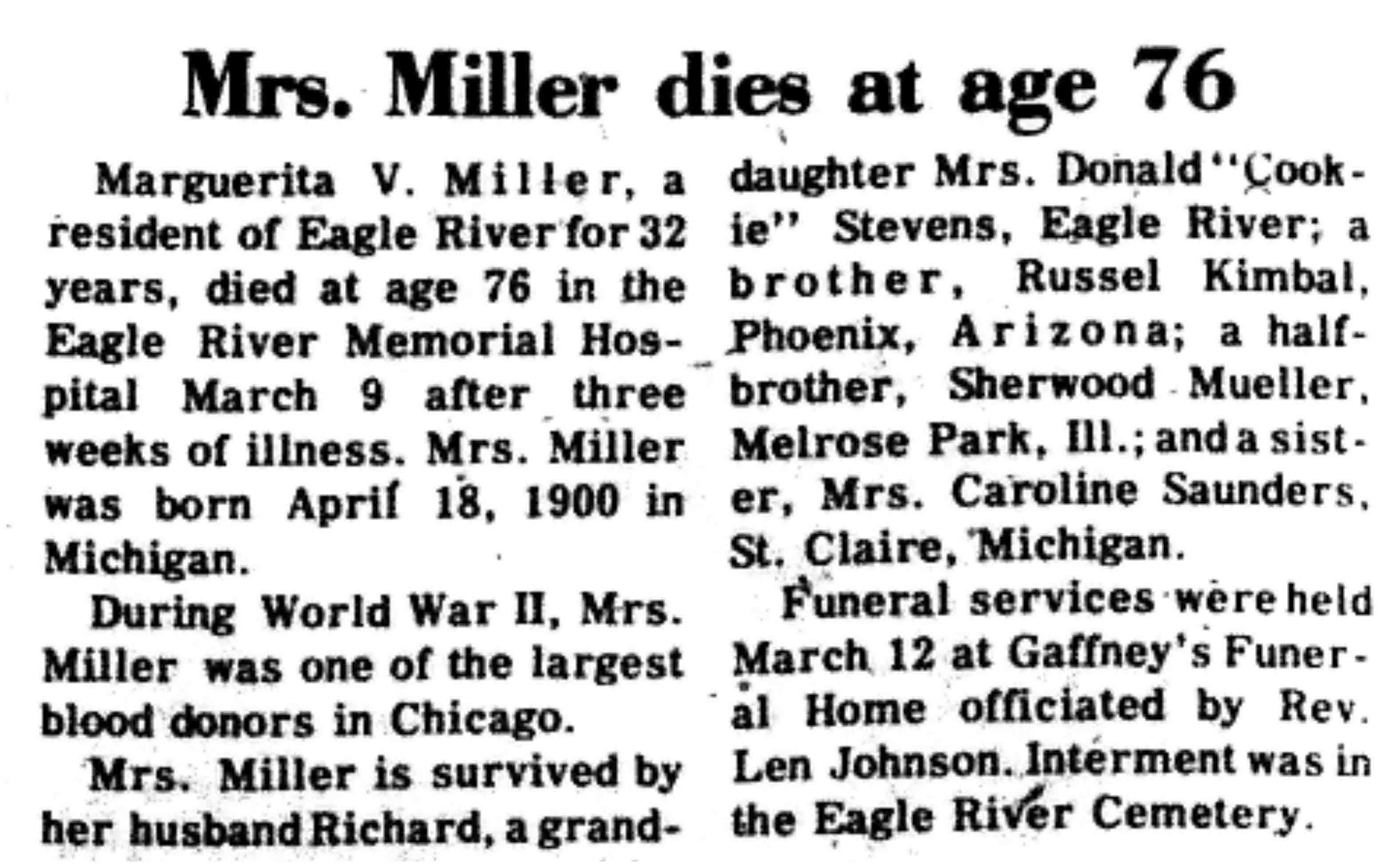 | Miller | Marguerita V (Kimbal) | 18 Aug 1900 | 09 Mar 1977 | VCN | 17 Mar 1977 | 4 |