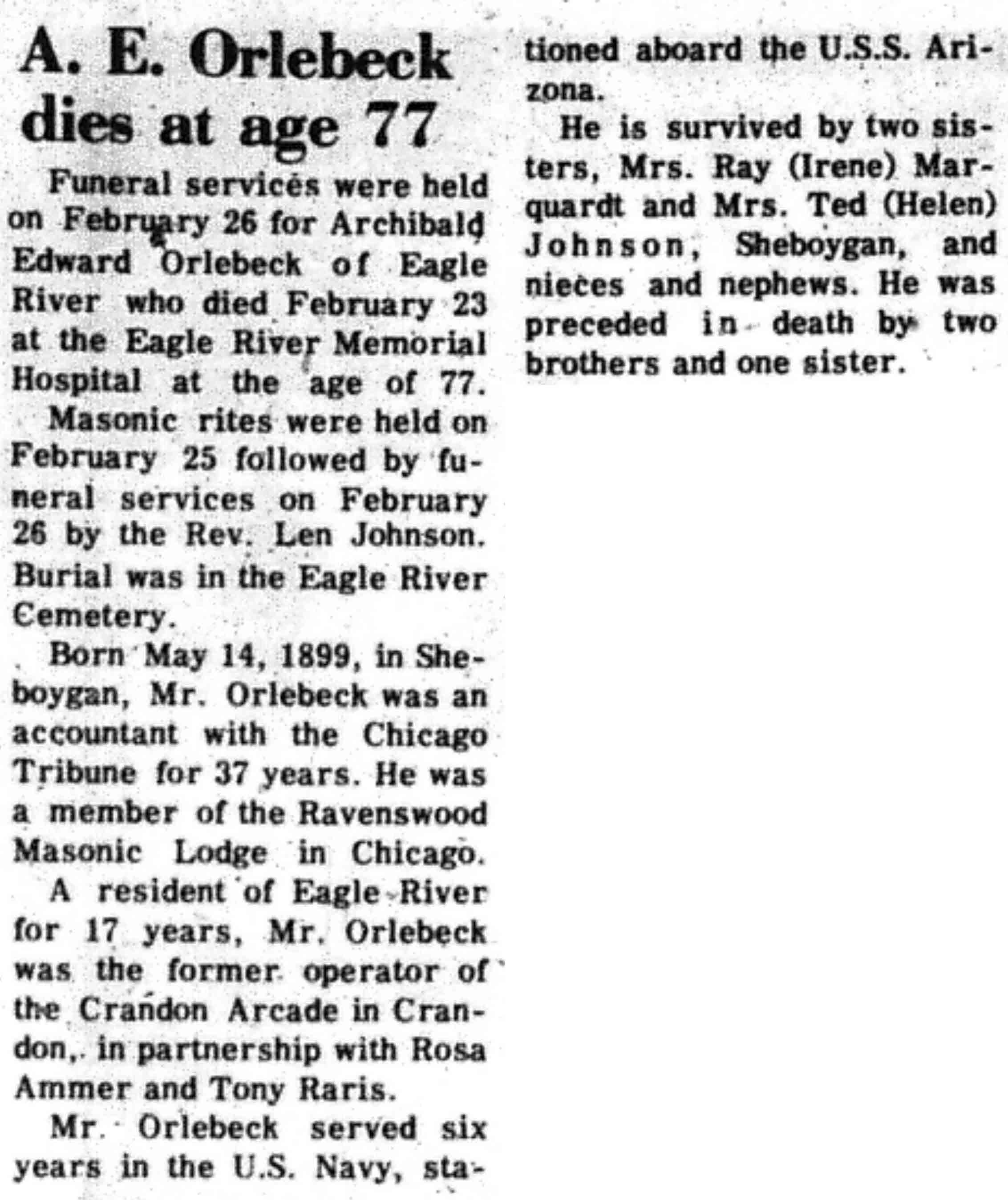 | Olson | Myron 'Mike' | c 1909 | 18 Jan 1977 | VCN | 10 Mar 1977 | 4 |