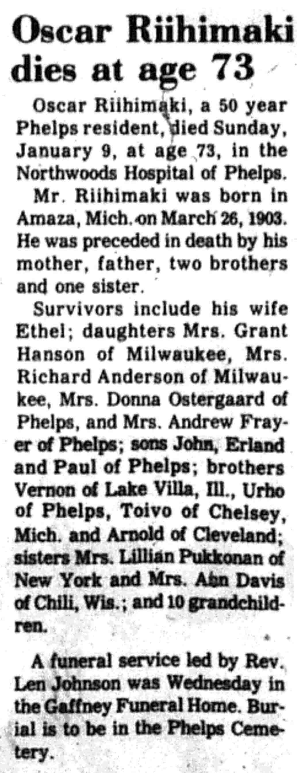 | Riihimaki | Oscar | 26 Mar 1903 | 09 Jan 1977 | VCN | 13 Jan 1977 | 7 |